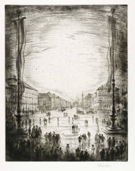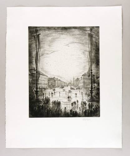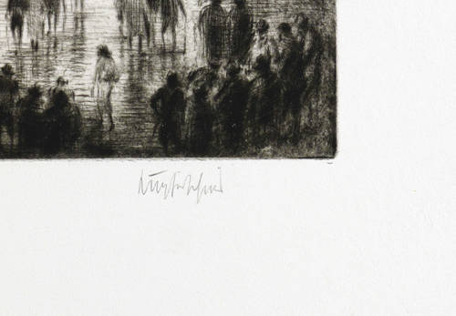 Um 1919. Radierung / Strichätzung, mit Plattenton, in Schwarz, auf gelblichem Büttenkarton. – Originale Künstlergrafik, von Hermann Kupferschmid. – 42,3 x 33,4 cm (Darstellung / Platte), 66 x 55 cm (Blatt).
