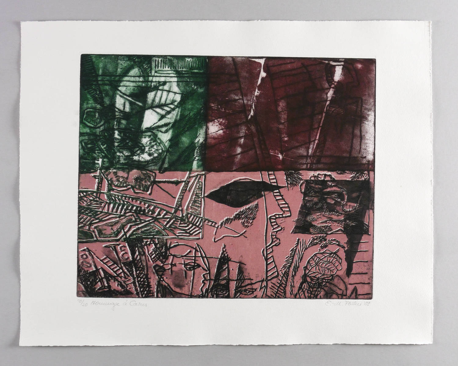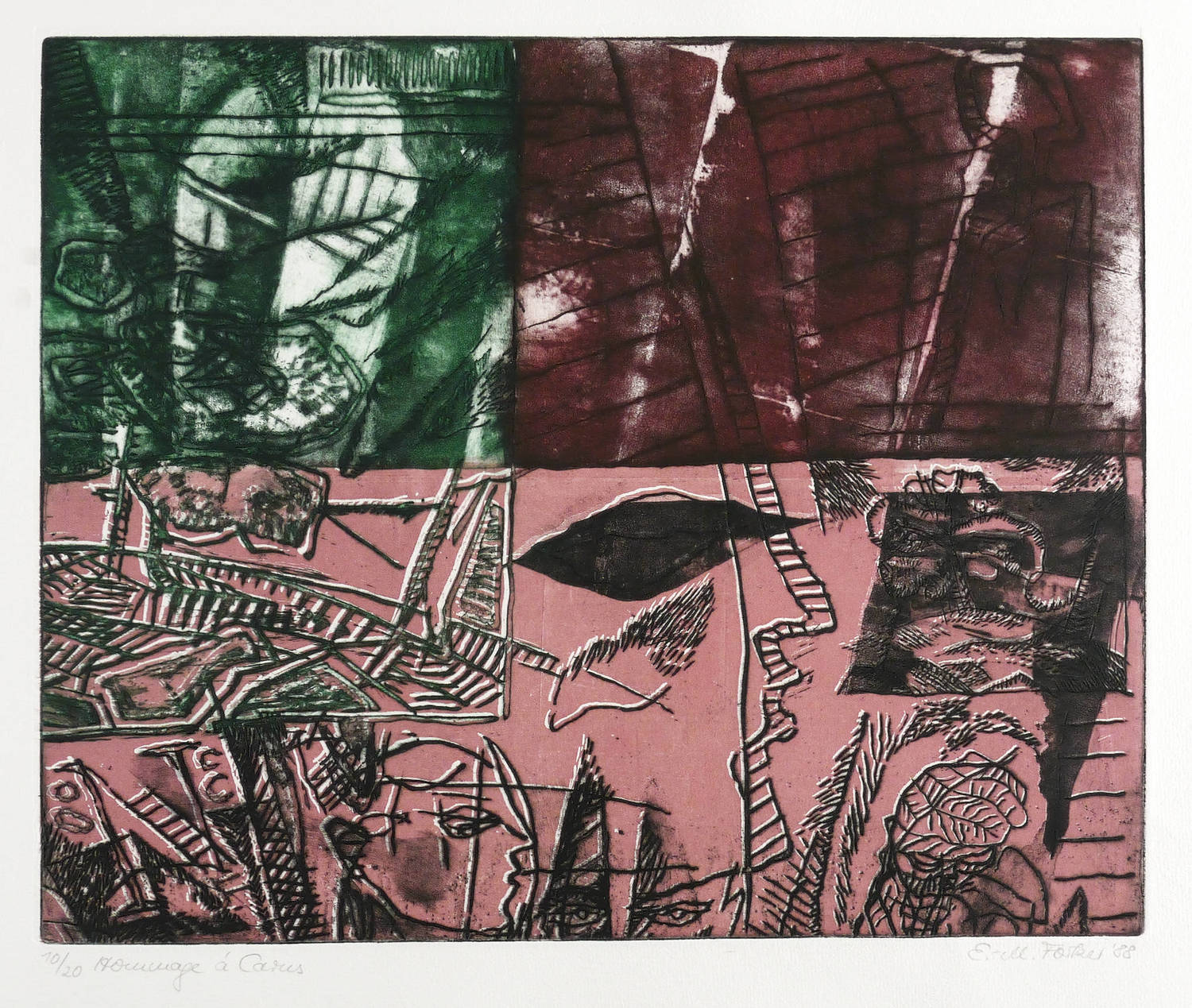 1988. Farbradierung / Strichätzung & Aquatinta, in Grün, Rot & Schwarz, auf hellchamois Hahnemühle. – Originale Künstlergrafik, von Eva-Maria Schreiter. – Auflage Exemplar Nr. 10/20. – 40,2 x 48,9 cm (Darstellung / Platte), 54 x 68 cm (Blatt).