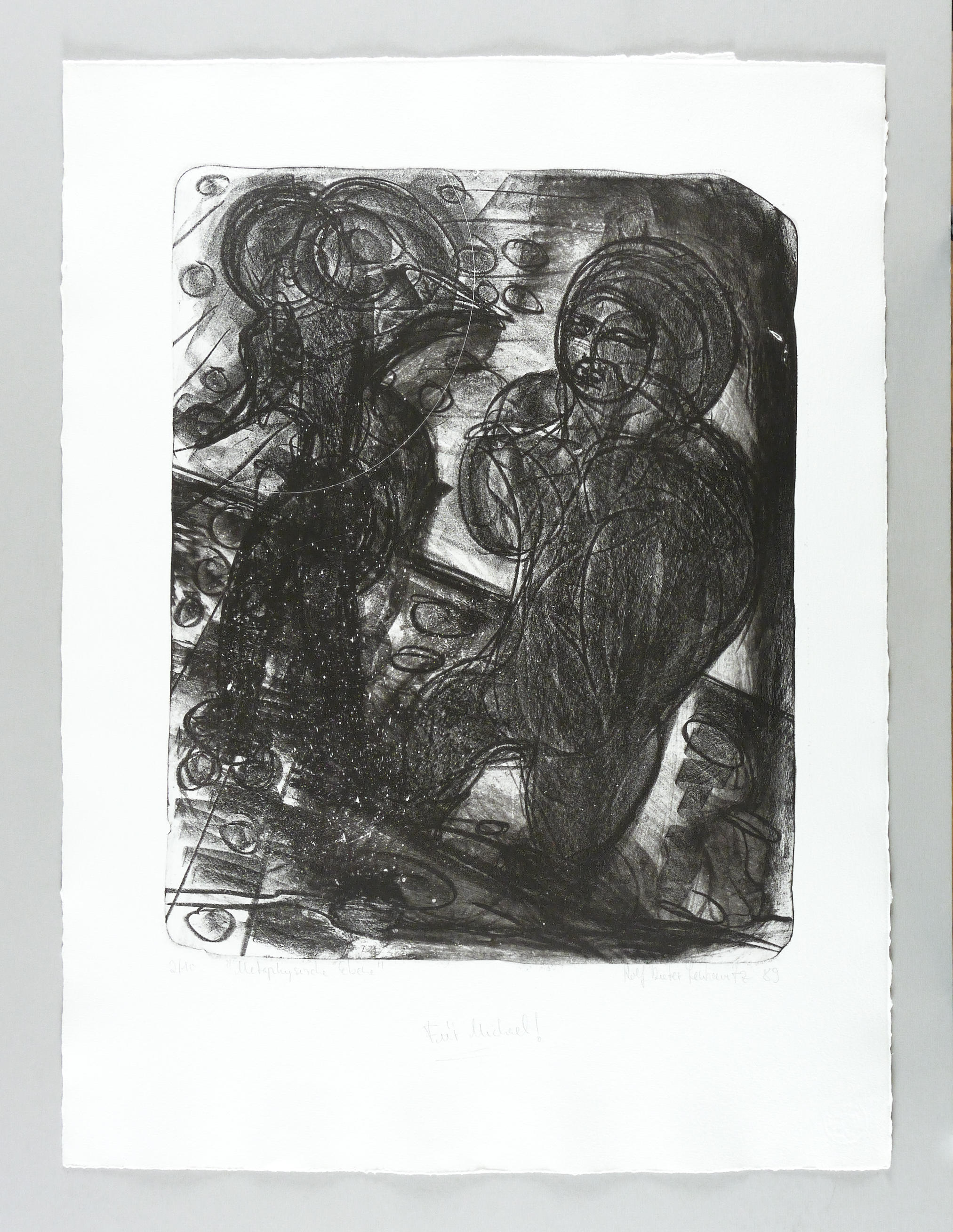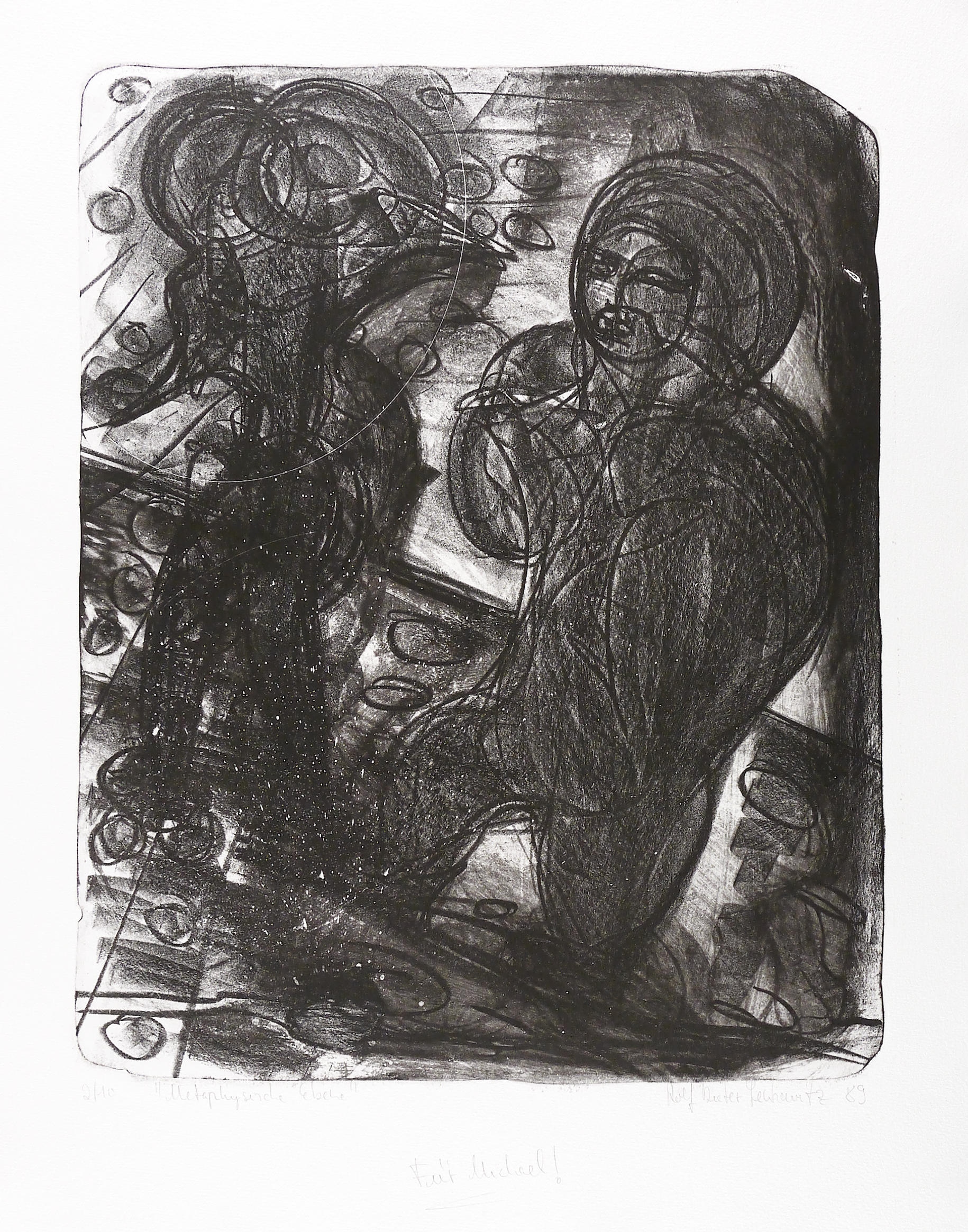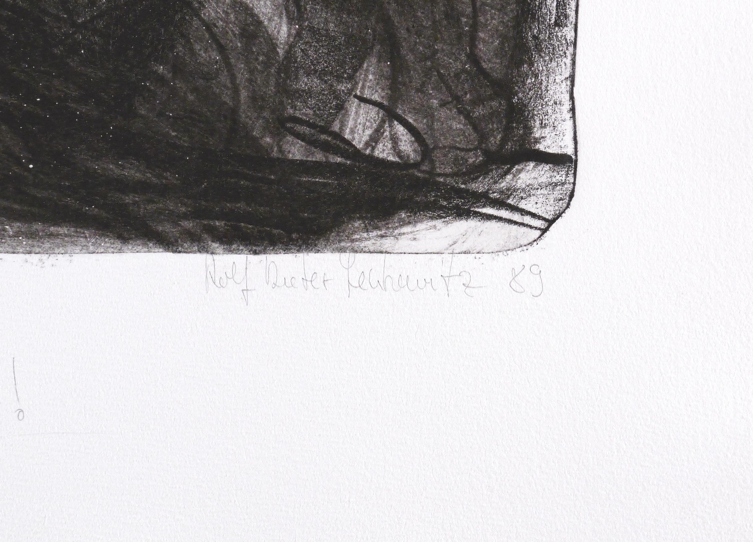 1989. Lithografie / Kreidelithografie, partiell geschabt, in Schwarz, auf schwerem hellchamois Hahnemühle. – Originale Künstlergrafik, von Rolf-Dieter Lenkewitz. – Auflage Exemplar Nr. 2/10. – 53,6 x 42,4 cm (Darstellung / Druckbild), 75 x 56 cm (Blatt).