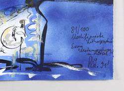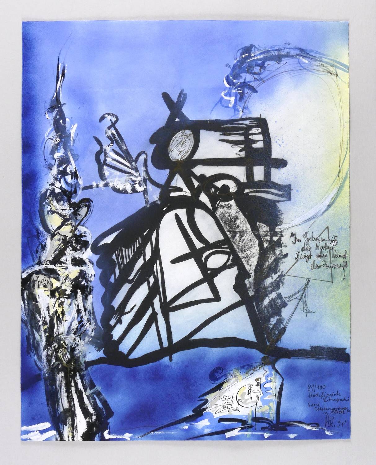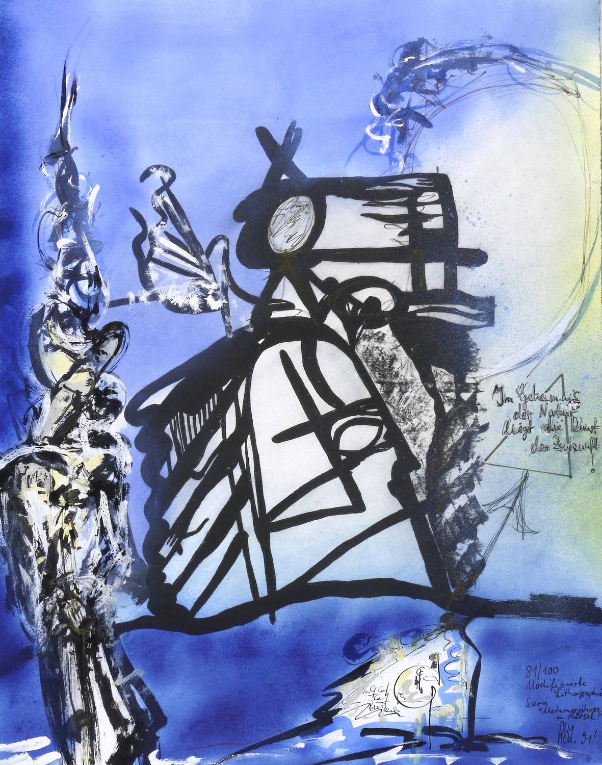 Rechts unten in Faserstift signiert und datiert. Dazu bezeichnet: ″81/100 Modifizierte Lithografie / Serie Metamorphose u. Rätsel!″ Am rechten Rand weiter bezeichnet: ″Im Geheimnis der Natur liegt die Kunst der Zukunft!″ Wasserzeichen von Zerkall. – Sehr guter Zustand.