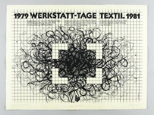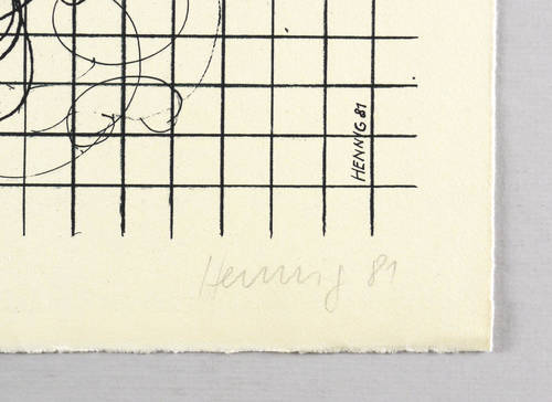 Rechts unten in Bleistift signiert und datiert: ″Hennig 81″. Links Auflagenbezeichnung: ″Vorzugsdruck″. Mittig Widmung für den Drucker Michael Wackwitz. Im Stein rechts unten Signatur und Jahr. Oben Inschrift, u.a.:″Ergebnisse der 1. und 2. Werkstatt-Tage für Textilgestaltung des VBK- DDR in Schneeberg 1979 und 1981″. – Originales Künstlerplakat zur Ausstellung ″Werkstatt-Tage Textil″ in der Textil- und Kunstgewerbe-Sammlung der Städtischen Museen Karl-Marx-Stadt 9.-31.10.1981. – Sehr gut erhalten.