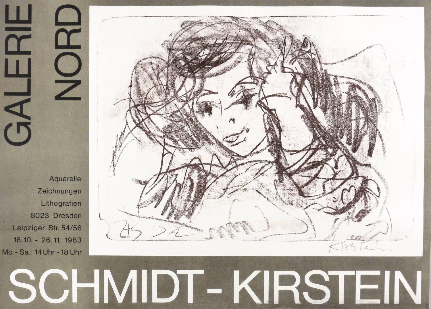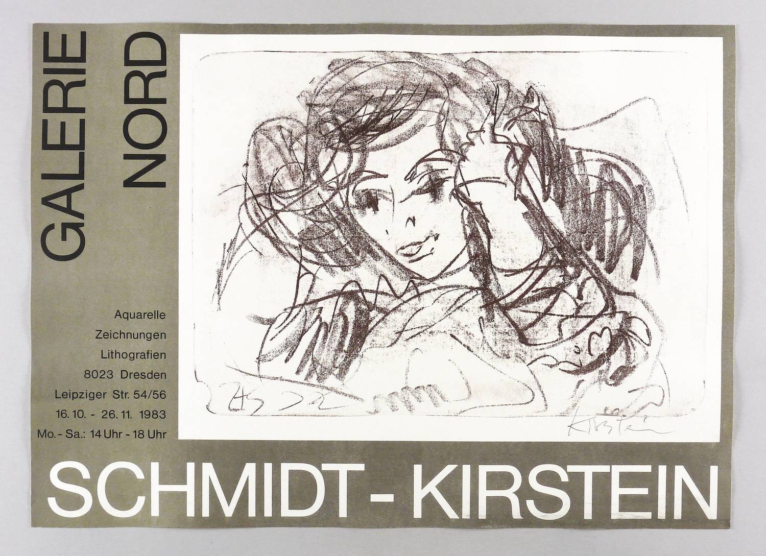 Rechts unter der Darstellung in Bleistift signiert: ″Kirstein″. – Originalgrafisches Plakat zur Ausstellung ″Schmidt-Kirstein. Aquarelle, Zeichnungen, Lithografien″ 16.10.-26.11.1983 in der Galerie Nord in Dresden. – Unscheinbare Lagerspuren im unteren Rand. Insgesamt guter Zustand.