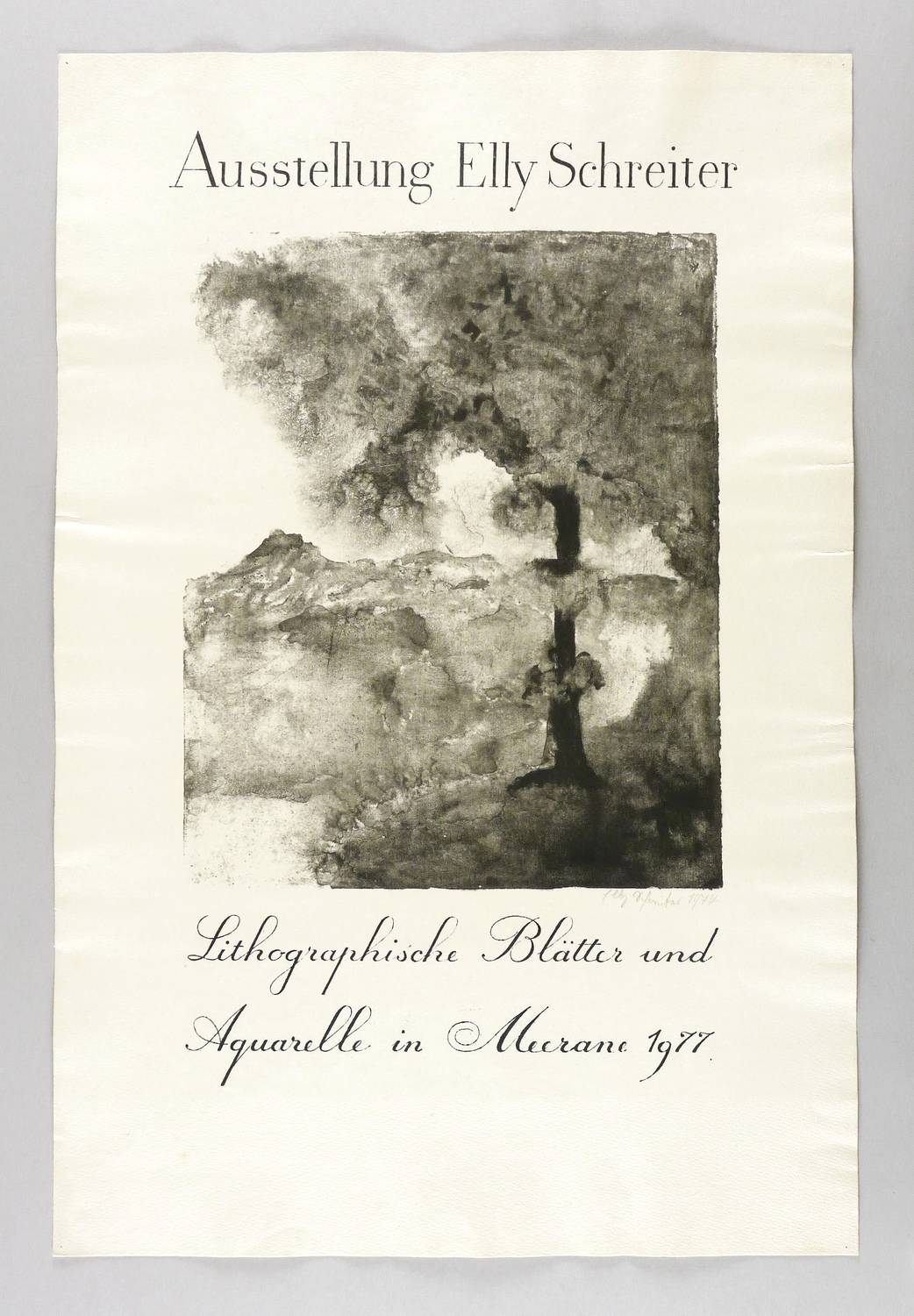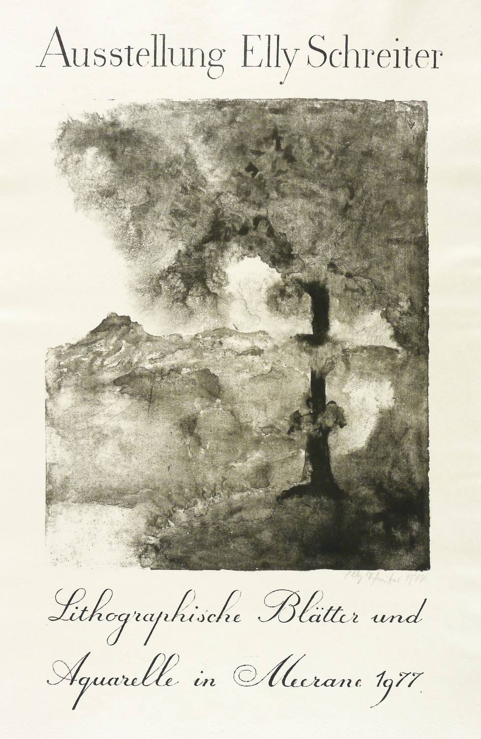 Rechts unten in Bleistift signiert und datiert: ″Elly Schreiter 77″. Diverse Inschriften im Stein. – Originalgrafisches Plakat zur Ausstellung ″Elly Schreiter. Lithographische Blätter und Aquarelle″ 1977 in Meerane. – Sehr guter Zustand.