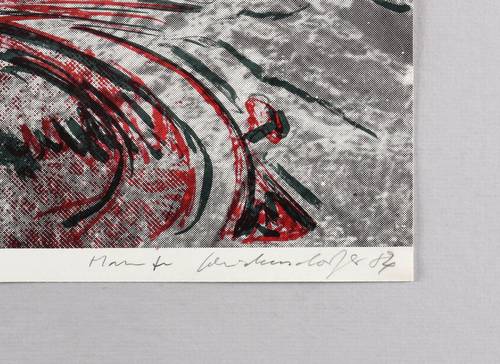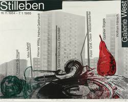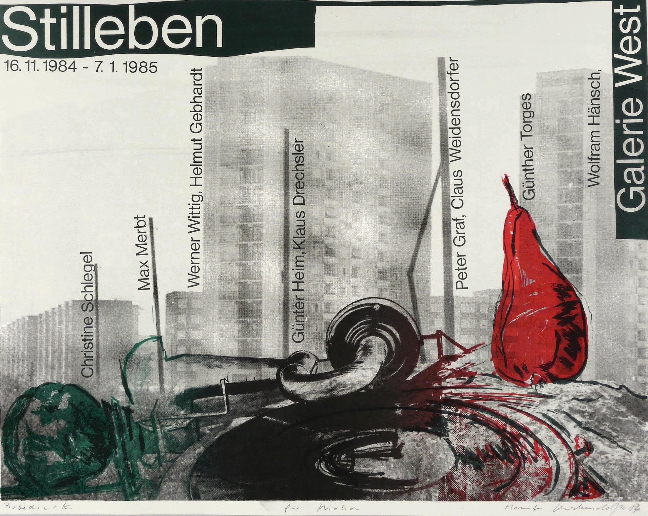 In Bleistift links unten von beiden Künstlern signiert und datiert: ″Haufe Weidensdorfer 84″. Widmung für den Drucker Michael Wackwitz. Diverse Inschriften. – Originalgrafisches Künstlerplakat zur Ausstellung ″Stilleben″ mit den Künstlern Christine Schlegel, Max Merbt, Werner Wittig Helmut Gebhardt, Günther Heim, Klaus Drechsler, Peter Graf, Claus Weidensdorfer, Günther Torges und Wolfram Hänsch in der Galerie West in Dresden 16.11.1984-7.1.1985. – Nicht bei Muschter. – Sehr guter Zustand.