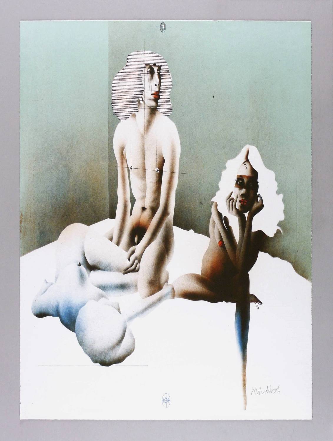 1973. Farblithografie / Kreide- & Pinsellithografie, in Zinnober, Blau & Türkis, auf hellchamois BFK Rives. – Originale Künstlergrafik, von Paul Wunderlich. – 75,5 x 55,5 cm (Darstellung / Blatt).