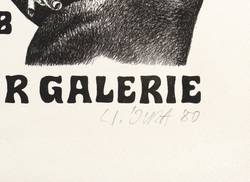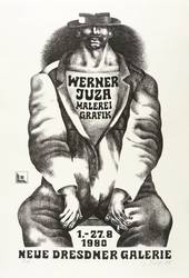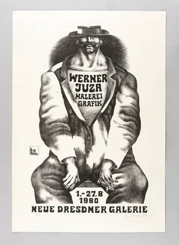 Rechts unten in Bleistift signiert und datiert: ″W. Juza 80″. Links Auflagenbezeichnung: ″1/60″. Diverse Inschriften. – Originalgrafisches Plakat zur Ausstellung ″Werner Juza. Malerei, Grafik″ 1.8.-27.8.1980 in der Neuen Dresdner Galerie des Staatlichen Kunsthandels der DDR. – Sehr guter Zustand.