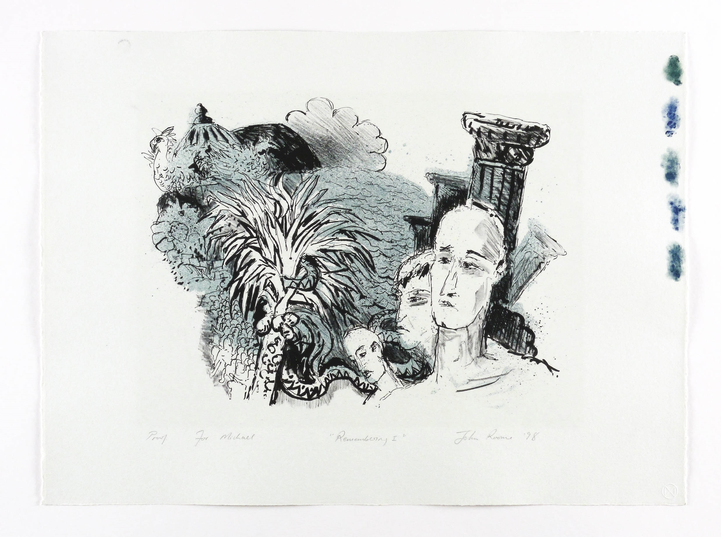 Rechts unten in Bleistift signiert und datiert: ″John Roome ’98″. Links eigenhändige Auflagenbezeichnung: ″Proof″. Mittig Titel: ″Remembering I″. Trockenstempel des Steindruckers Michael Wackwitz. – Im rechten Blattrand Farbproben aus dem Andruck. Links oben im Rand Fingerfleck aus dem Druckprozess. Sehr guter Zustand.