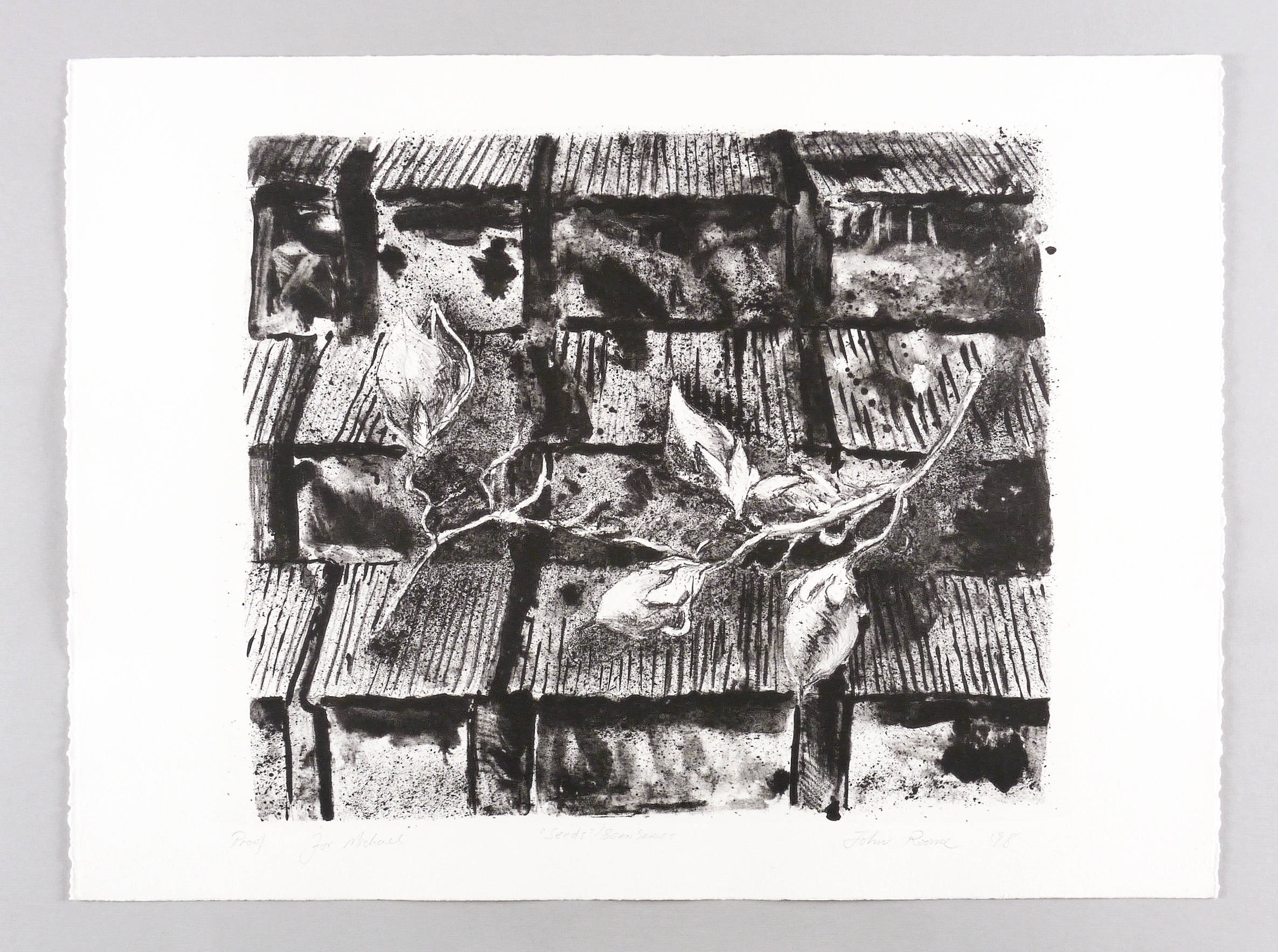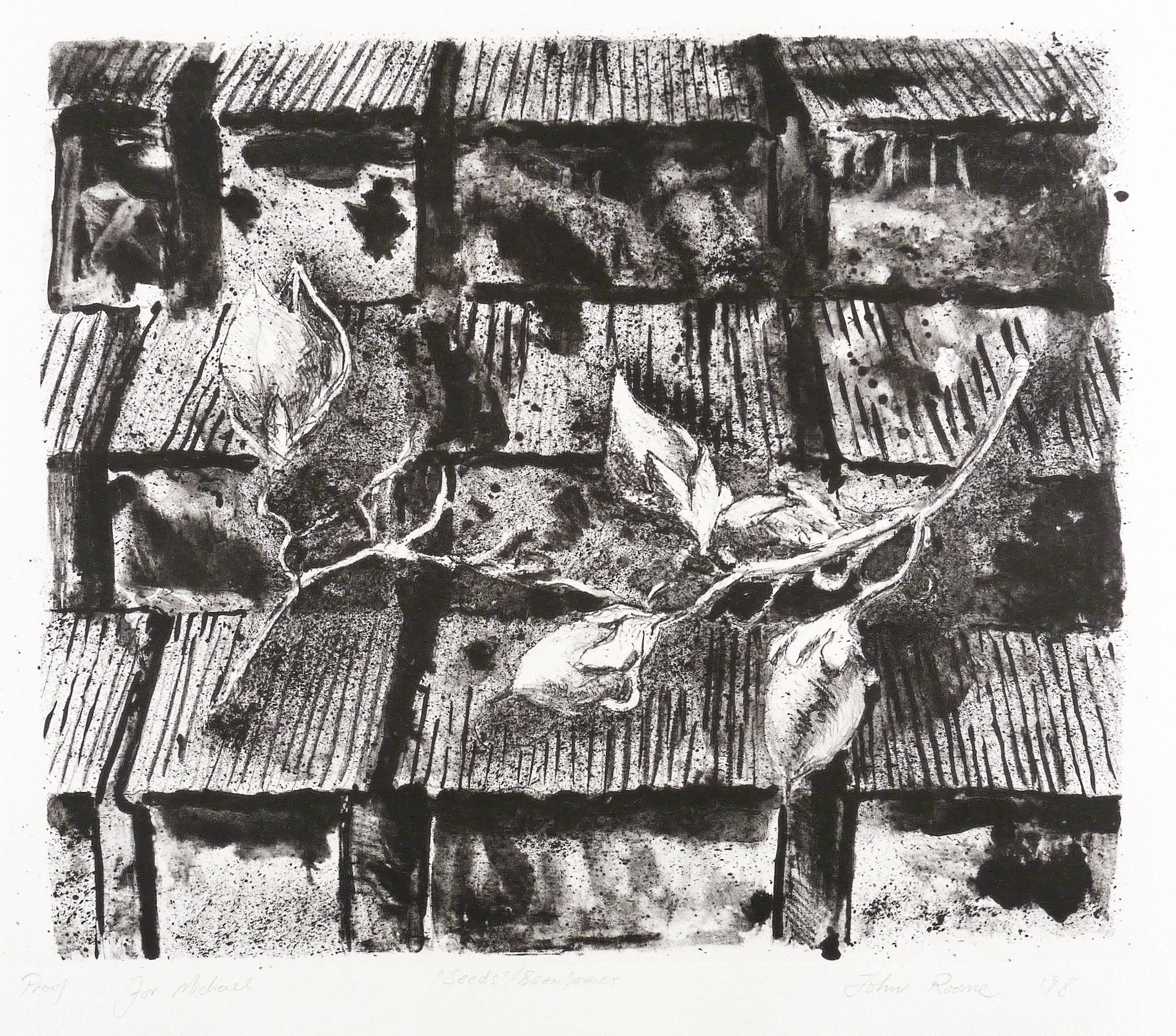 Rechts unten in Bleistift signiert und datiert: ″John Roome ’98″. Links eigenhändige Auflagenbezeichnung: ″Proof″. Mittig Titel: ″Seeds/Bean Series″. – Sehr gutes Exemplar.