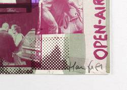 Rechts unten in Bleistift signiert und datiert: ″Haufe 81″. Mittig eigenhändige Widmung für den Steindrucker Michael Wackwitz. – Originalgrafisches Künstlerplakat für das Open-Air-Konzert der ″Jazzwerkstatt Peitz″ 1981 auf der Fischerfestwiese Peitz bei Cottbus, einem populären Jazz- und Free- Jazz-Format der DDR, dem sogenannten ″Woodstock im Spreewald″. – Kleiner Einriss im linken Rand (15 mm) hinterlegt. Sonst ohne Mängel. Noch guter Zustand.