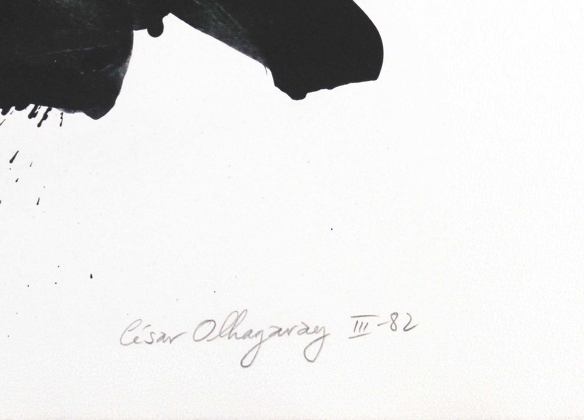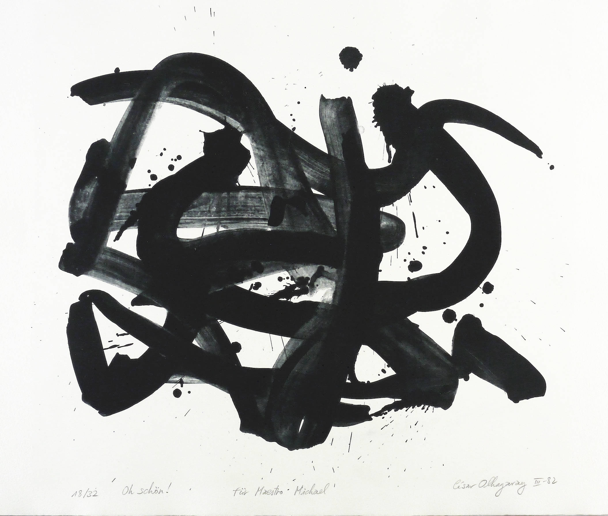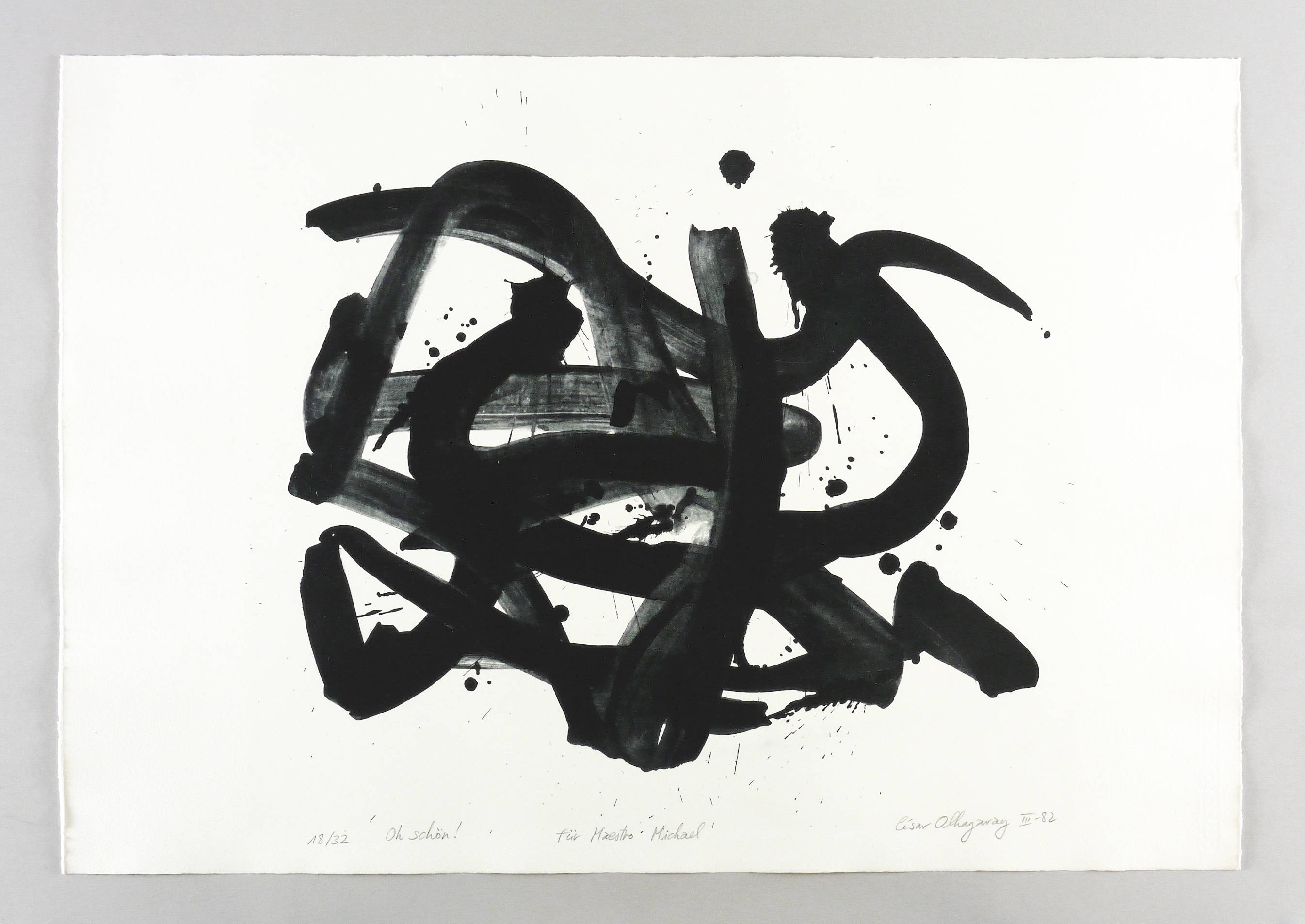 1982. Offsetlithografie / Pinsellithografie, in Schwarz, auf hellchamois Hahnemühle. – Originale Künstlergrafik, von César Olhagaray. – Auflage Exemplar Nr. 18/32. – 53 x 77 cm (Blatt), 49,3 x 54,2 cm (Darstellung / Druckbild).