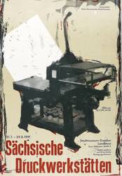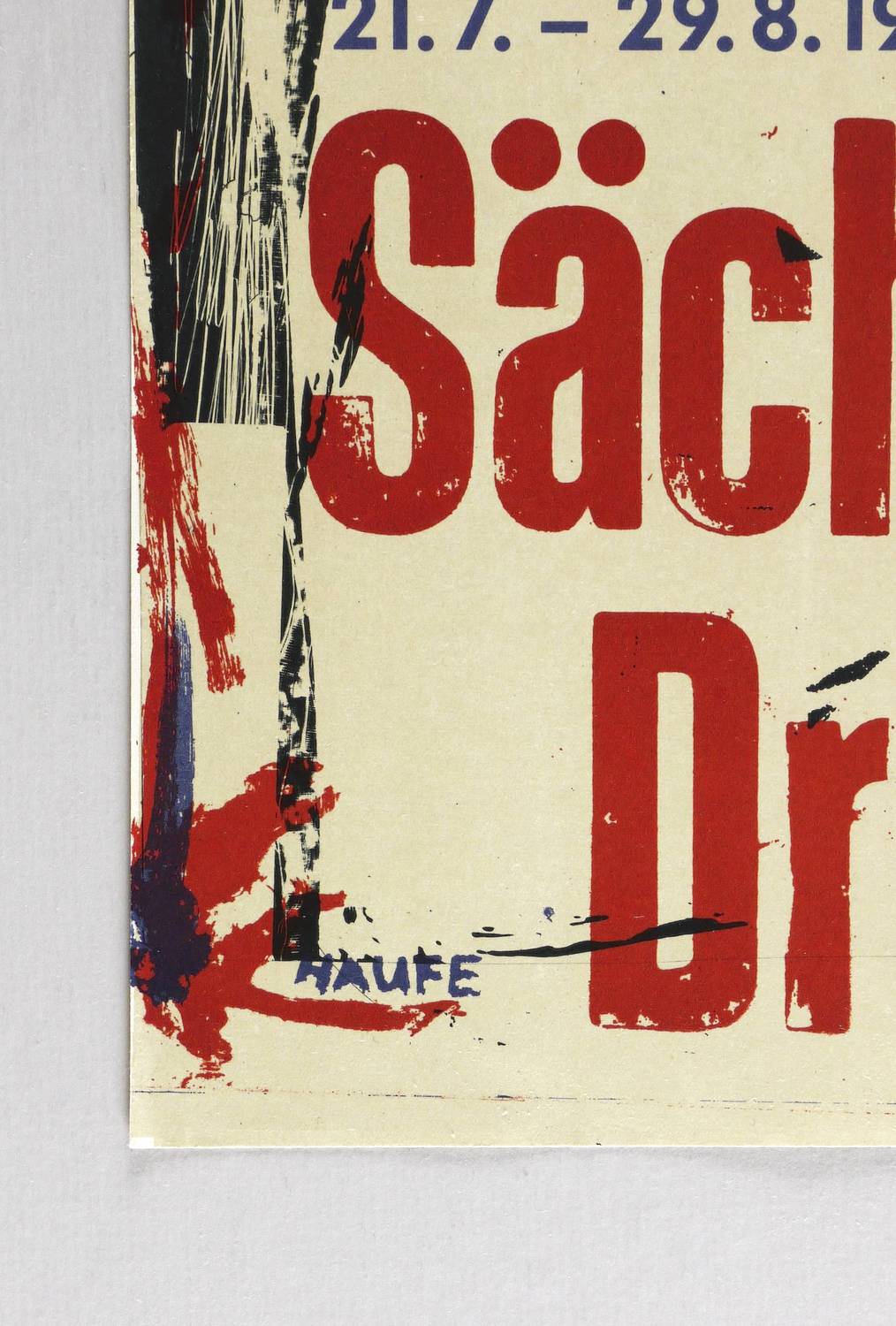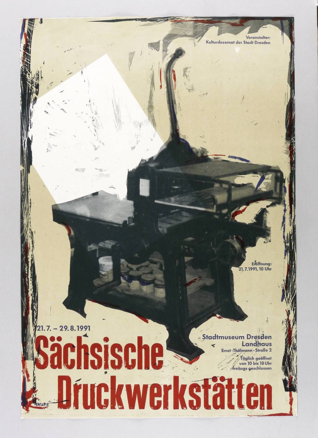 Nicht handsigniert. Links unten im Stein signiert: ″HAUFE″. Diverse Inschriften in der Darstellung. – Originalgrafisches Plakat zur Ausstellung ″Sächsische Druckwerkstätten″ im Stadtmuseum Dresden im Landhaus Dresden vom 21.7.-29.8.1991. – Originalrandiges Exemplar. Blattkanten partiell geringfügig gestaucht. Insgesamt guter Zustand.