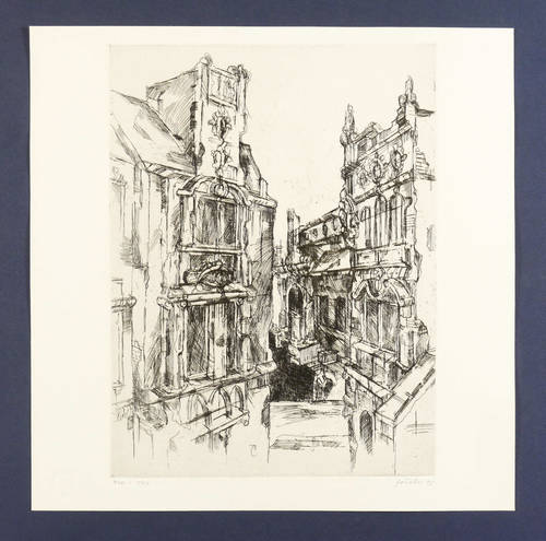 1985. Radierung / Strichätzung, in Schwarz, mit Plattenton, auf hellgelbem Karton. – Originale Künstlergrafik, von Wieland Förster. – Auflage Exemplar Nr. XVII/XXV. – 31,9 x 24,0 cm (Darstellung / Platte), 36 x 36 cm (Blatt).