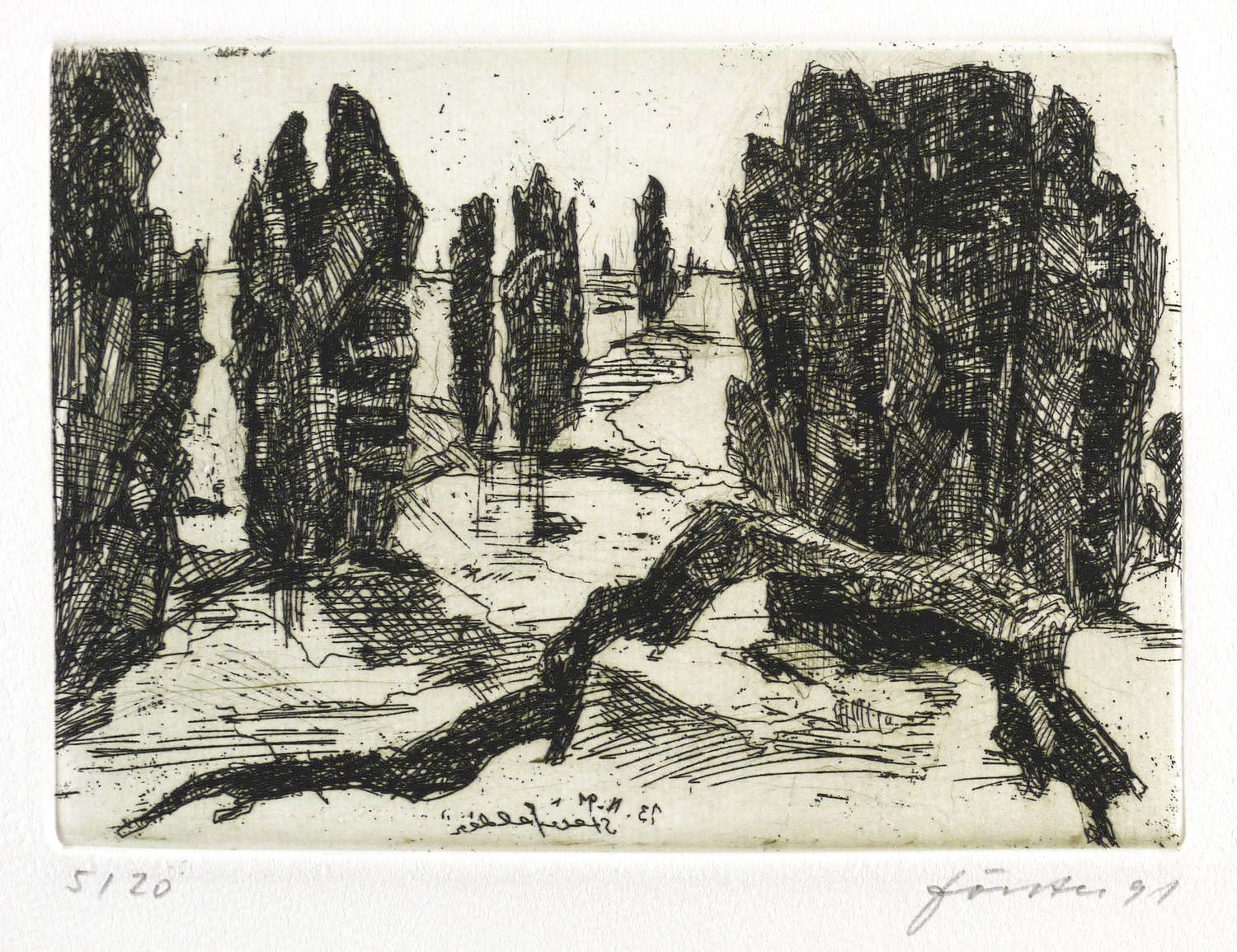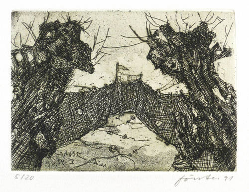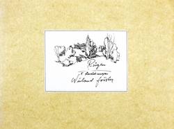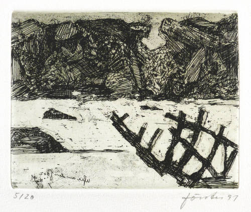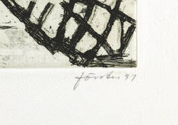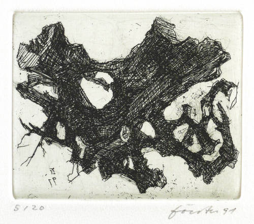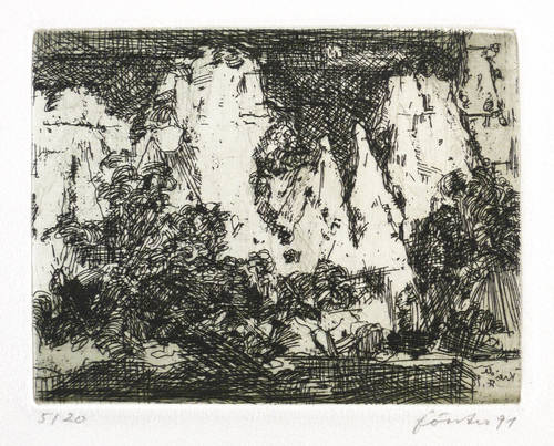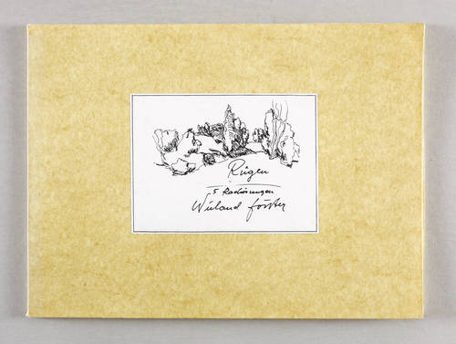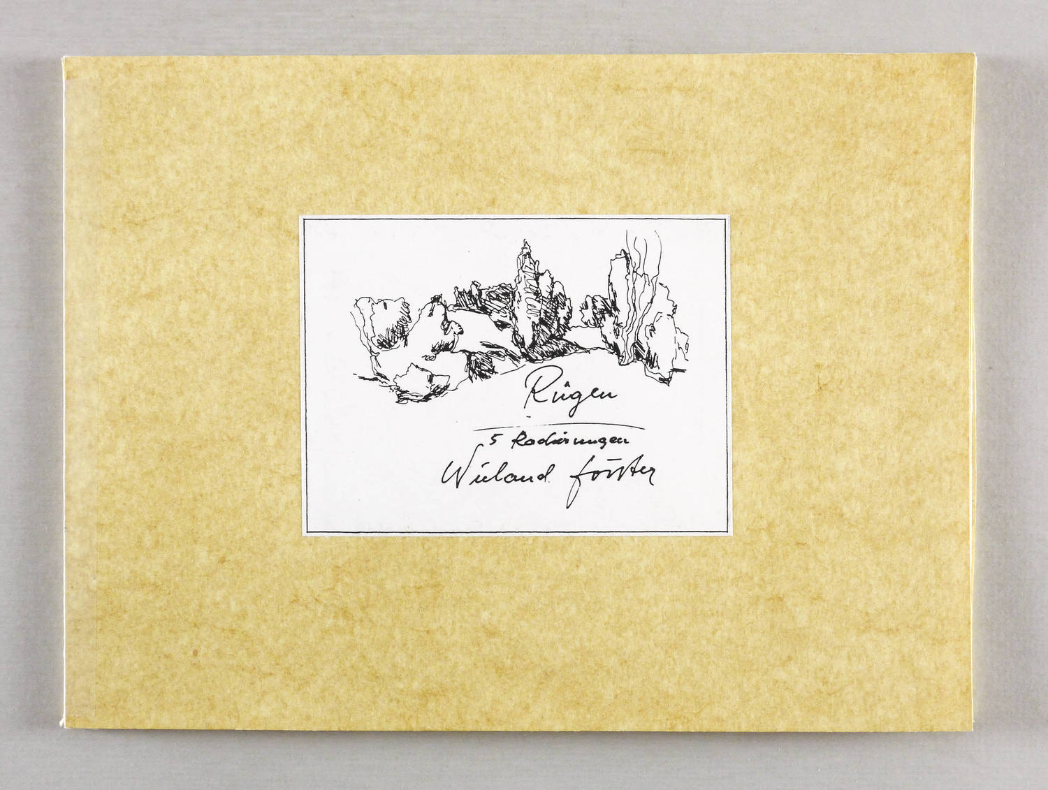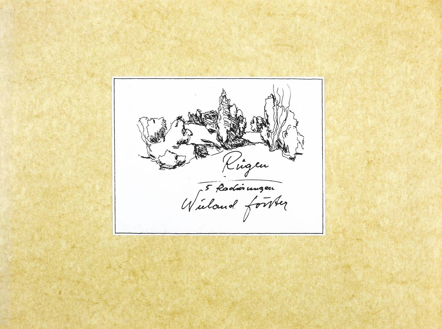 Aus: Wieland Förster, Rügen. 5 Radierungen (Berlin: Eigenverlag 1991). – Alle Grafiken rechts unten in Bleistift signiert und datiert: ″förster 91″. Links Auflagenbezeichnung. In den Platten jeweils bezeichnet, monogrammiert und datiert. Impressum mit Auflagenbezeichnung und Widmung. – Die originalgrafische Mappe mit fünf Radierungen Rügen-Landschaften. - Folge der Drucke: 1. Stubben. - Ufer an der Gor. - 3. Weiden und Netze. - 4. Kreidefelsen. - 5. Steinfelder. – Vollständig mit allen Grafiken und Umschlag. Die Papiere tadellos. Die Umschlagflügel links und oben repariert. Guter Zustand.