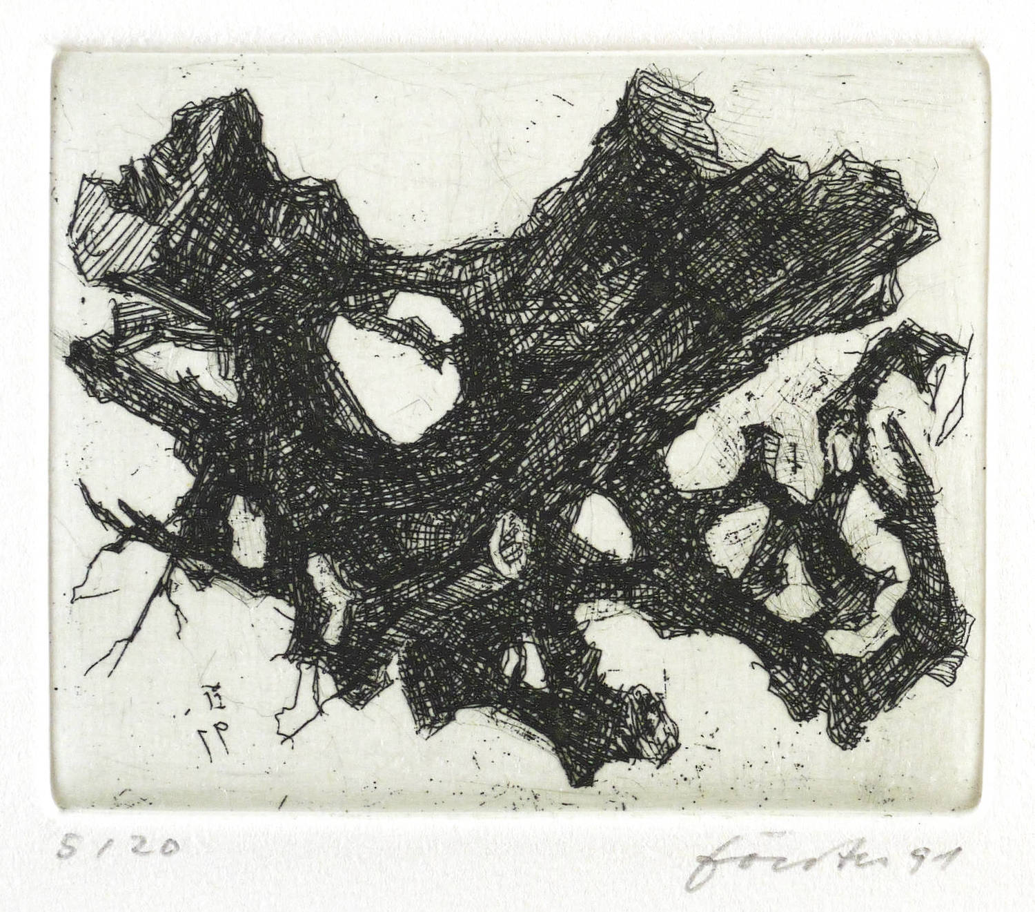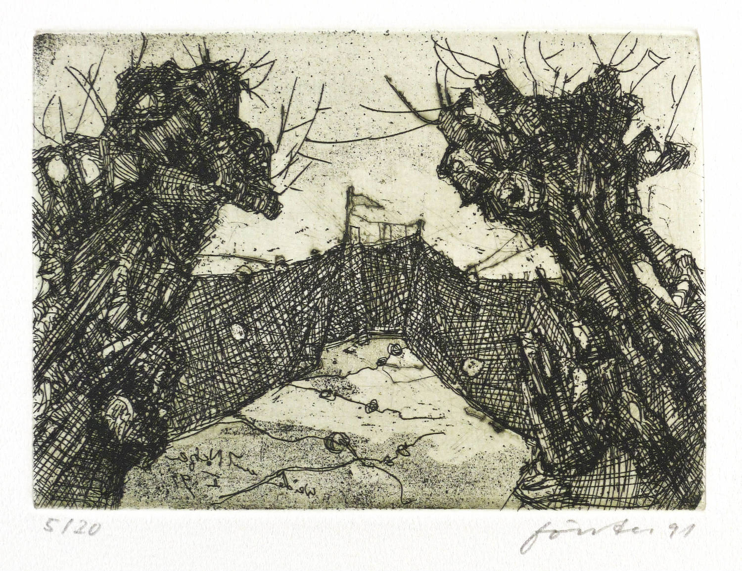1991. Radierung / Strichätzung, 5 Blatt, in Schwarz, mit Plattenton, auf hellchamois Velin. – Mappenwerk, von Wieland Förster. – Auflage Exemplar Nr. 5/20. – 20,5 x 27,5 cm (Mappe), 19,8 x 26,7 cm (Blätter).