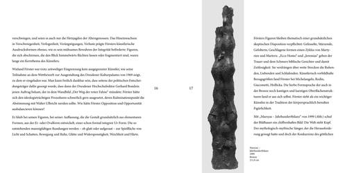 Wieland Förster (*1930 Dresden, lebt bei Berlin). Deutscher Bildhauer, Grafiker und Schriftsteller. 1944-46 Lehre als technischer Zeichner und Rohrleger. 1946-50 Zwangsarbeit in Bautzen. 1953-58 studierte er Bildhauerei an der Hochschule für Bildende Künste in Dresden bei Walter Arnold und Hans Steger. 1959-61 Meisterschüler an der Deutschen Akademie der Künste in Ost-Berlin bei Fritz Cremer. Danach freischaffend und viele Auslandsreisen. 1968-72 Ausstellungsverbot in der DDR. 1974 Mitglied der Ost-Berliner Deutschen Akademie der Künste. 1979-90 Vizepräsident der Deutschen Akademie der Künste. Seit 1985 ordentlicher Professor. 1996 Mitbegründer der Sächsischen Akademie der Künste in Dresden.