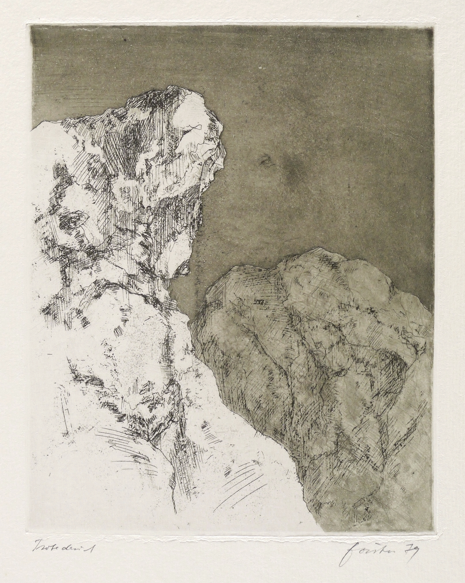 1979. Radierung / Strichätzung & Aquatinta, in Schwarz, auf hellchamois Weißenborn. – Originale Künstlergrafik, von Wieland Förster. – Probedruck. – 18,8 x 14,9 cm (Darstellung / Platte), 37 x 30 cm (Blatt).