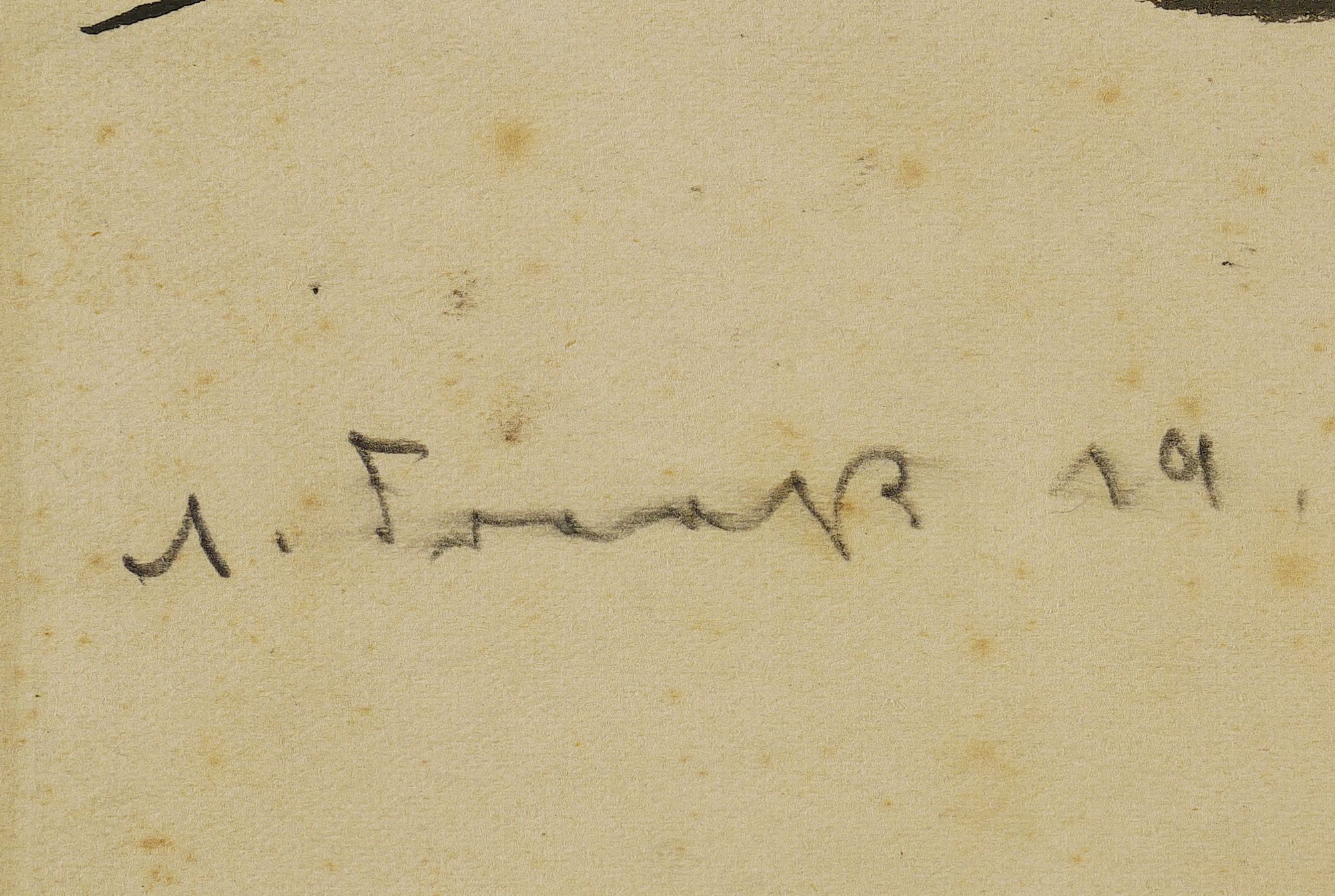 Links unten in Bleistift signiert und datiert. – Papier altersgemäß gedunkelt und etwas angeschmutzt. Durchgehend etwas stockfleckig. Am linken Rand Reste der Klebebindung eines Zeichenblocks. Am oberen Bildrand recto mit aufgeleimtem Papiergelenk auf Trägerkarton montiert. Nur mäßiger Zustand.