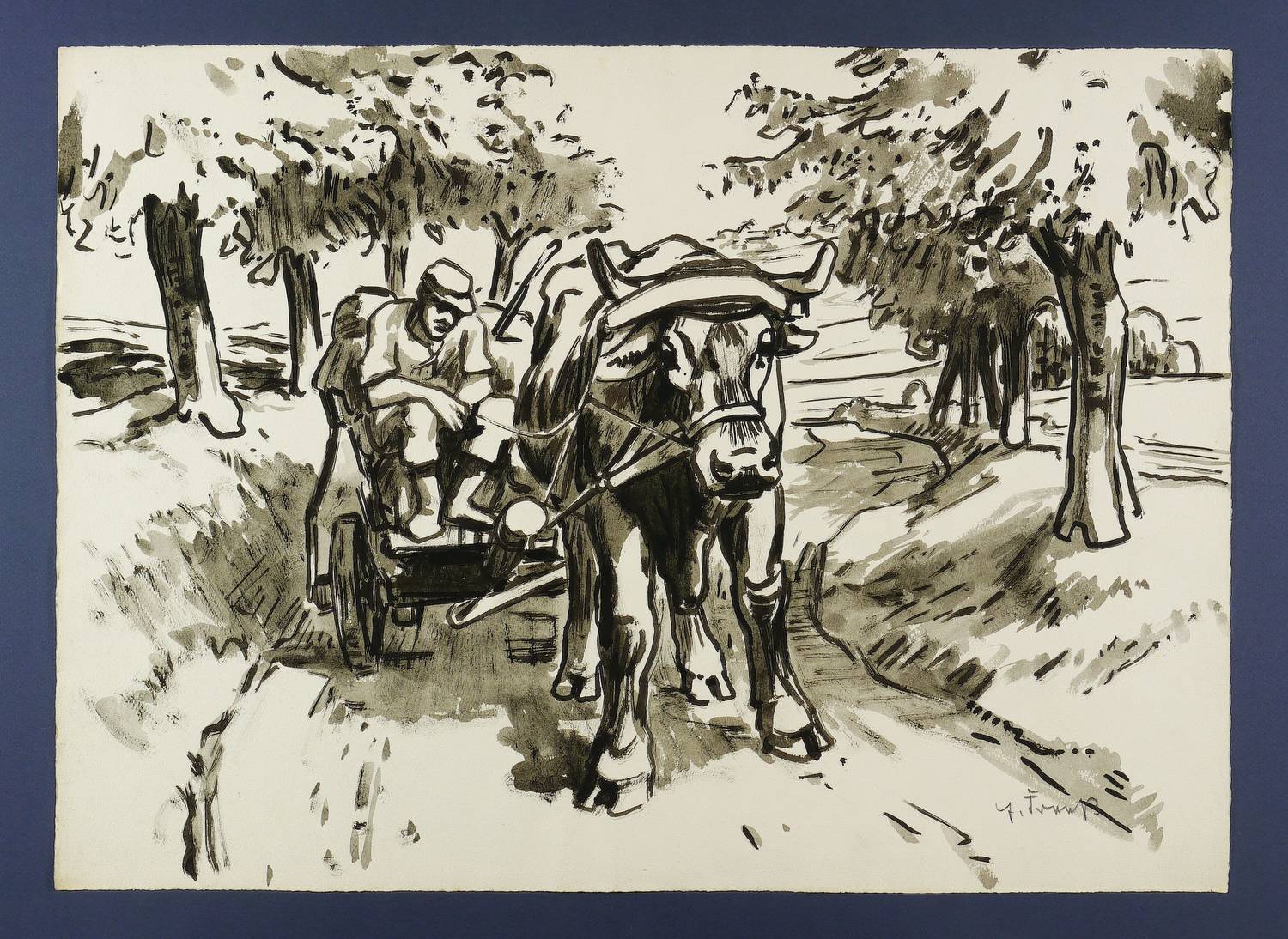 1950-1955. Zeichnung / Tusche, in Grau laviert, auf hellchamois Velinkarton. – Originale Künstlergrafik, von Erich Fraaß. – Unikat. – 48,0 x 66,6 cm (Darstellung / Blatt).