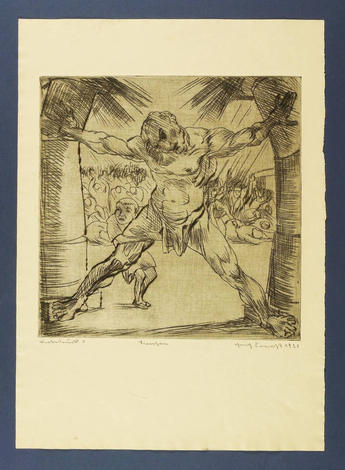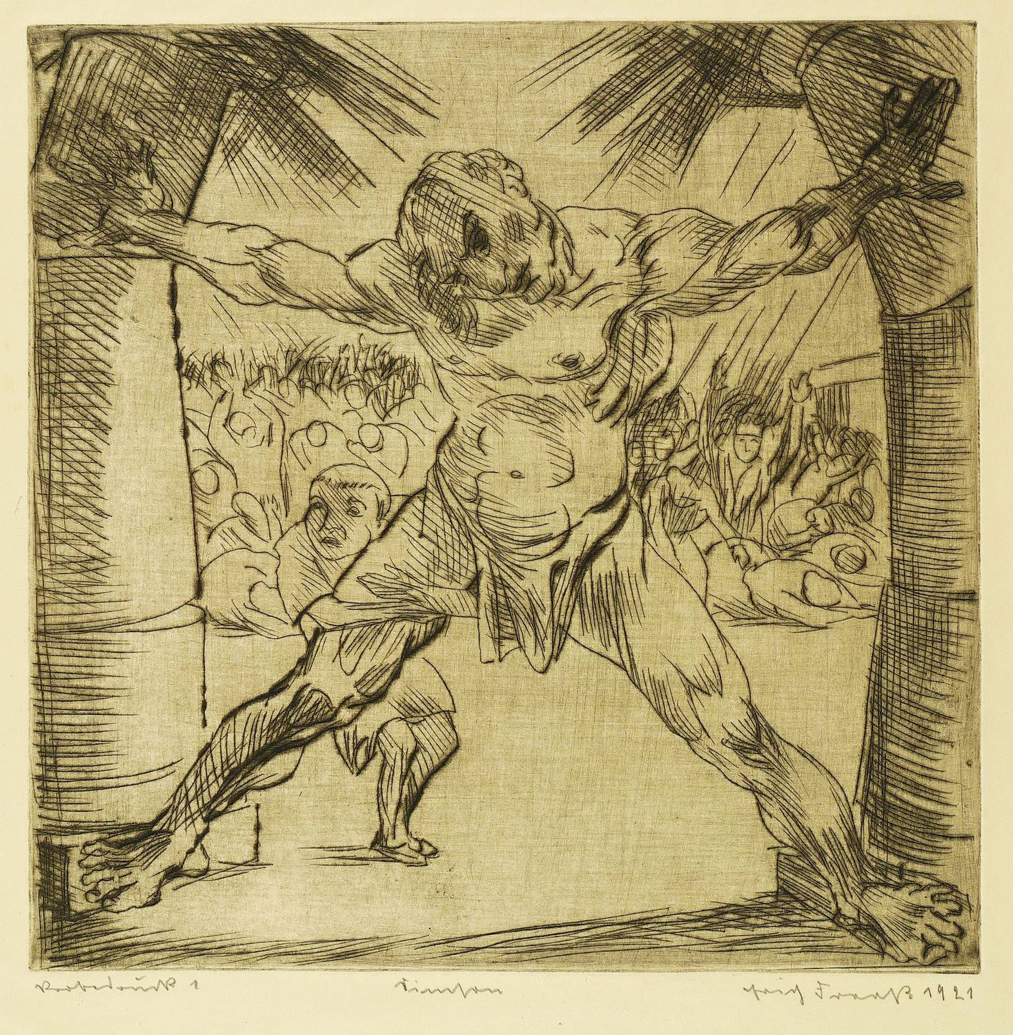 1921. Radierung / Kaltnadel, mit Plattenton, geschliffen, in Schwarzbraun, auf gelbem Velin. – Originale Künstlergrafik, von Erich Fraaß. – Probedruck Nr. 1. – 26,8 x 26,8 cm (Darstellung / Platte), 44 x 32 cm (Blatt).