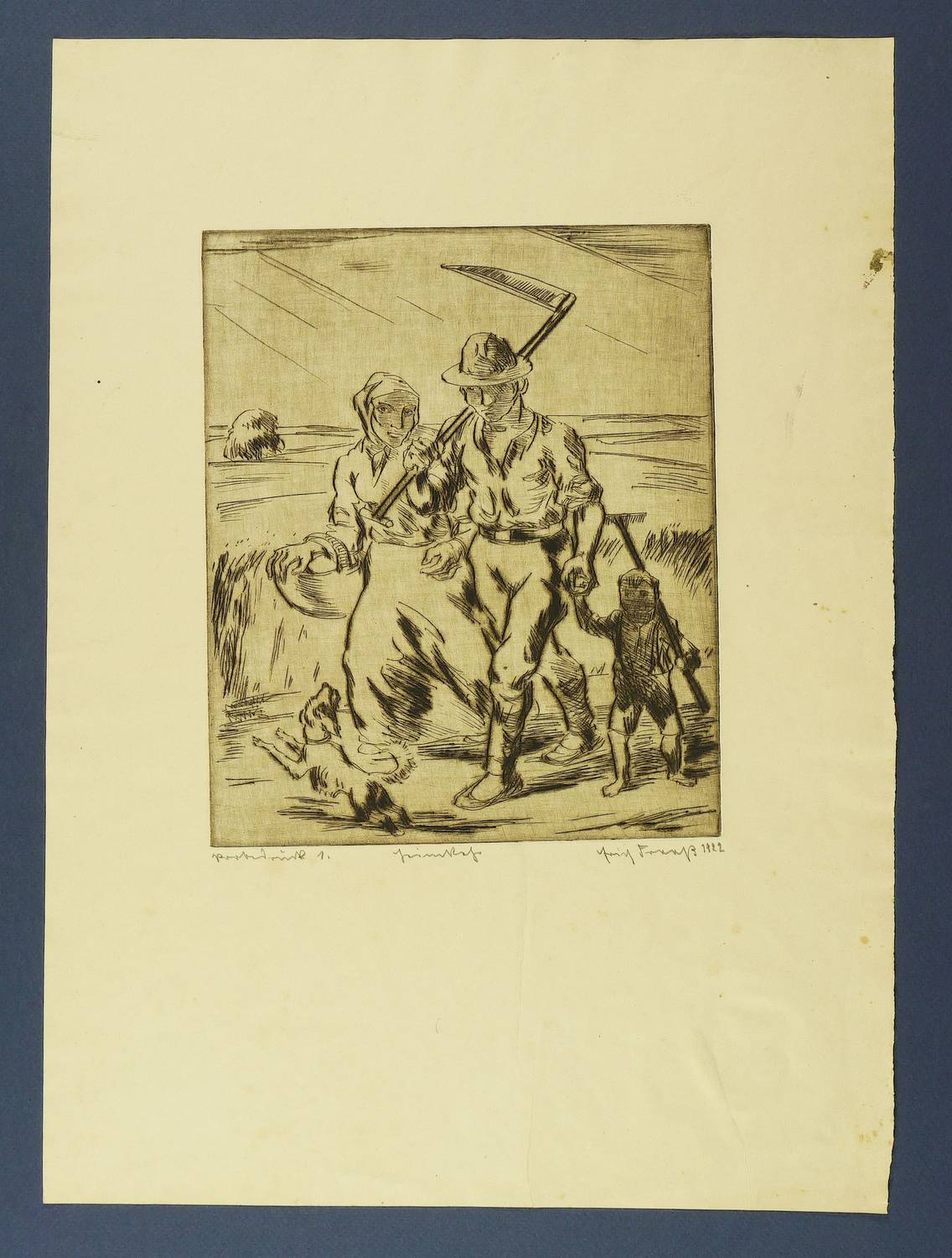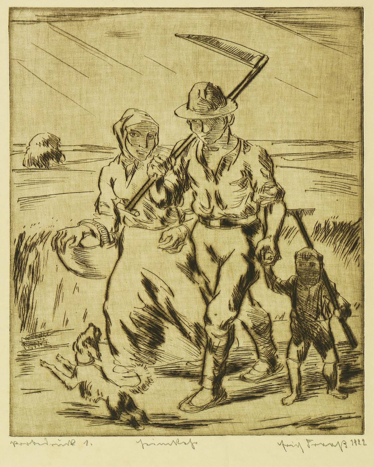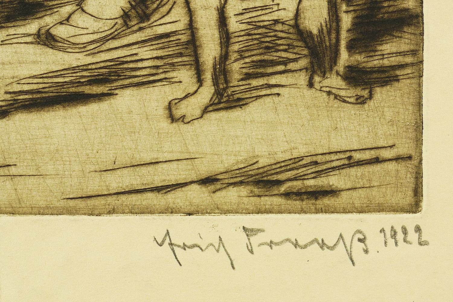 1922. Radierung / Kaltnadel, mit Plattenton, partiell geschliffen, in Schwarz, auf gelbem Velin. – Originale Künstlergrafik, von Erich Fraaß. – Probedruck Nr. 1. – 23,3 x 19,2 cm (Darstellung / Platte), 44 x 32 cm (Blatt).