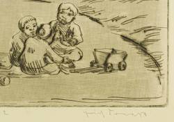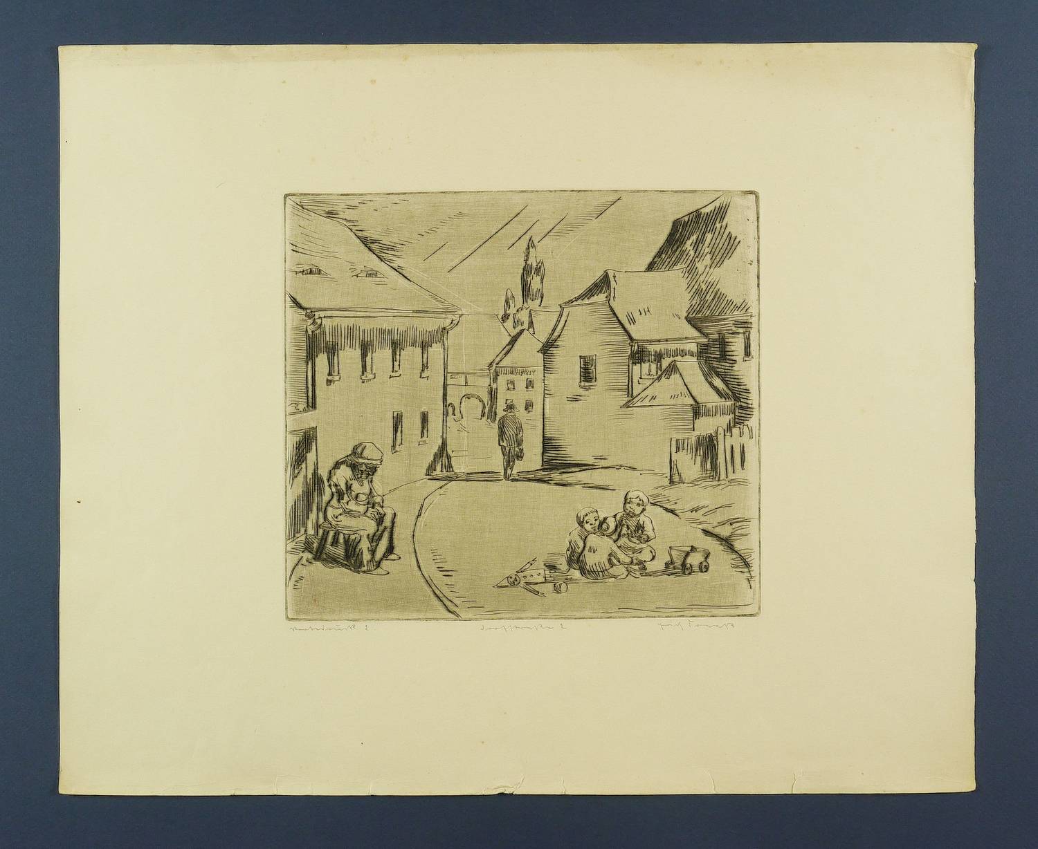Rechts unten in Bleistift signiert. Mittig betitelt. Links dazu eigenhändige Auflagenbezeichnung. – Papier altersgemäß leicht gebräunt. Am oberen und unteren Blattrand weit außerhalb der Darstellung stärker gedunkelt sowie riss- und knickspurig. Wenige Stockfleckchen. Sonst gut erhalten.