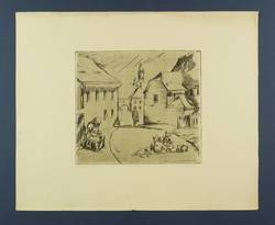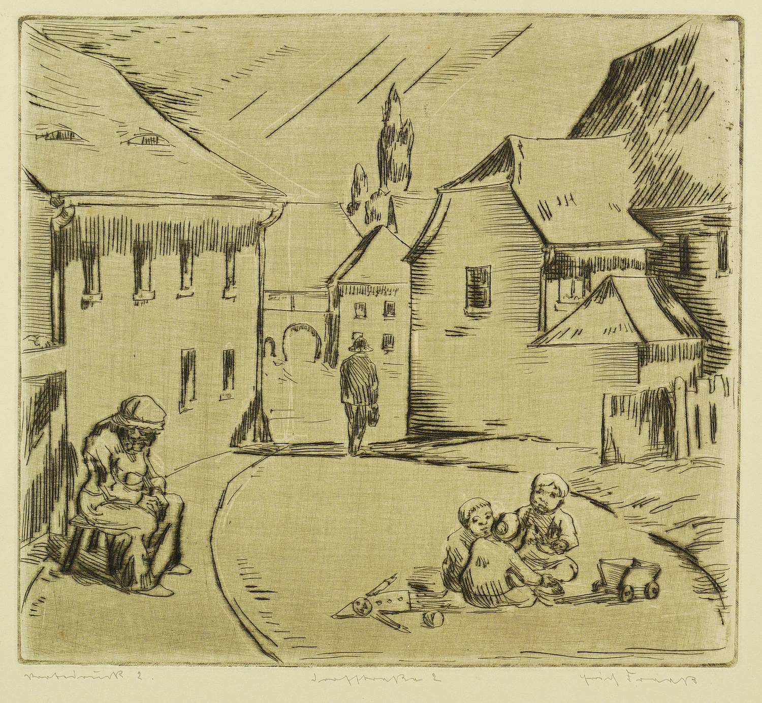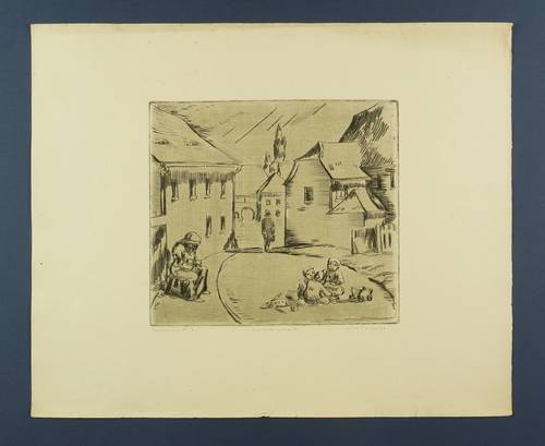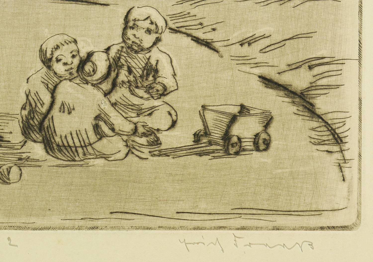 Um 1920. Radierung / Kaltnadel, mit Plattenton, geschliffen, in Schwarz, auf gelbem Velin. – Originale Künstlergrafik, von Erich Fraaß. – Probedruck Exemplar Nr. 2. – 23,5 x 26,0 cm (Darstellung / Platte), 41 x 50 cm (Blatt).