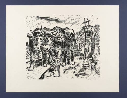 1938/1939. Linolschnitt, in Schwarz, auf hellem Velin. – Originale Künstlergrafik, von Erich Fraaß. – 36,0 x 41,5 cm (Darstellung / Druckstock), 50 x 64 cm (Blatt).