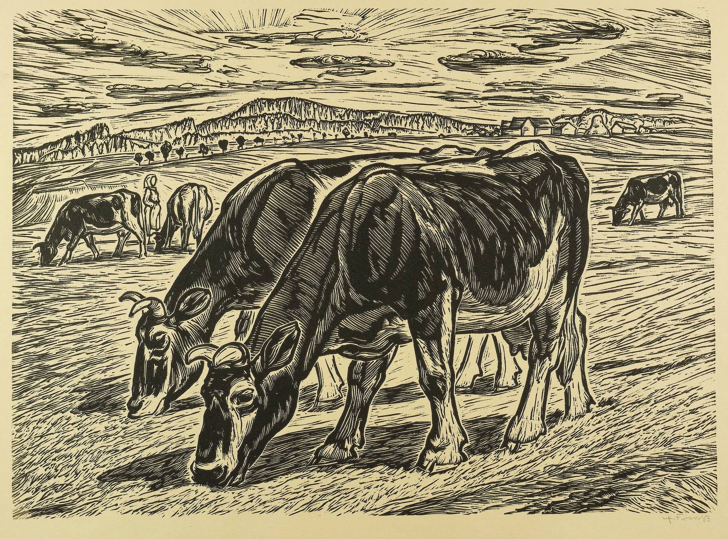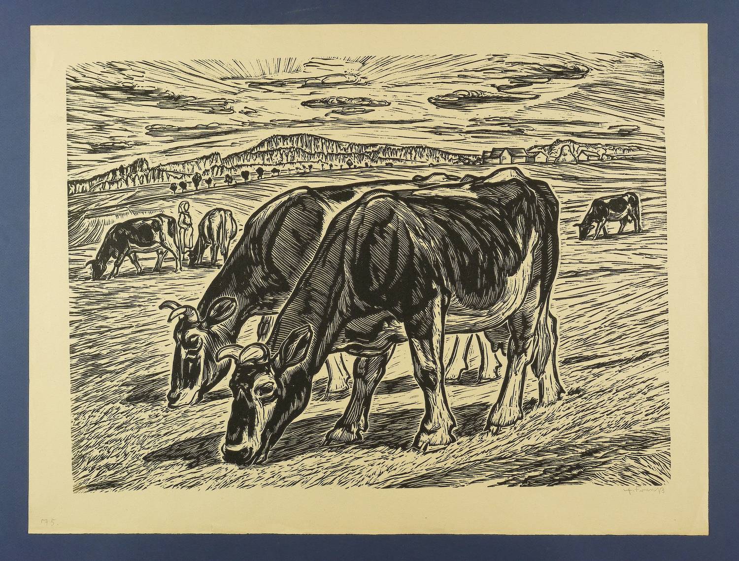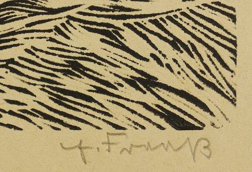 1938/1939. Linolschnitt, in Schwarz, auf gelbem Velin. – Originale Künstlergrafik, von Erich Fraaß. – 44,5 x 65,5 cm (Darstellung / Druckstock), 53 x 70,5 cm (Blatt).