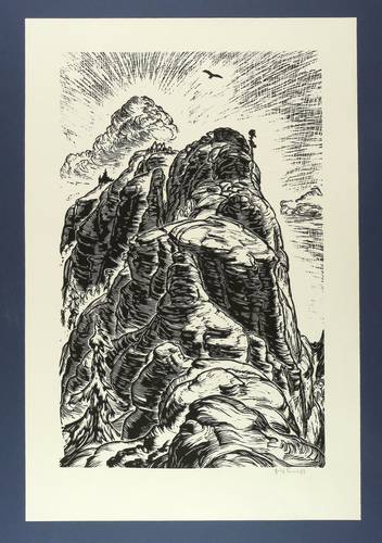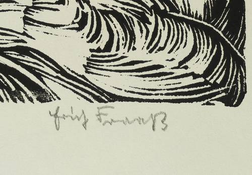1938/1939. Linolschnitt, in Schwarz, auf hellem Velinkarton. – Originale Künstlergrafik, von Erich Fraaß. – Unikat. – 63,0 x 40,0 cm (Darstellung / Druckstock), 75 x 50 cm (Blatt).