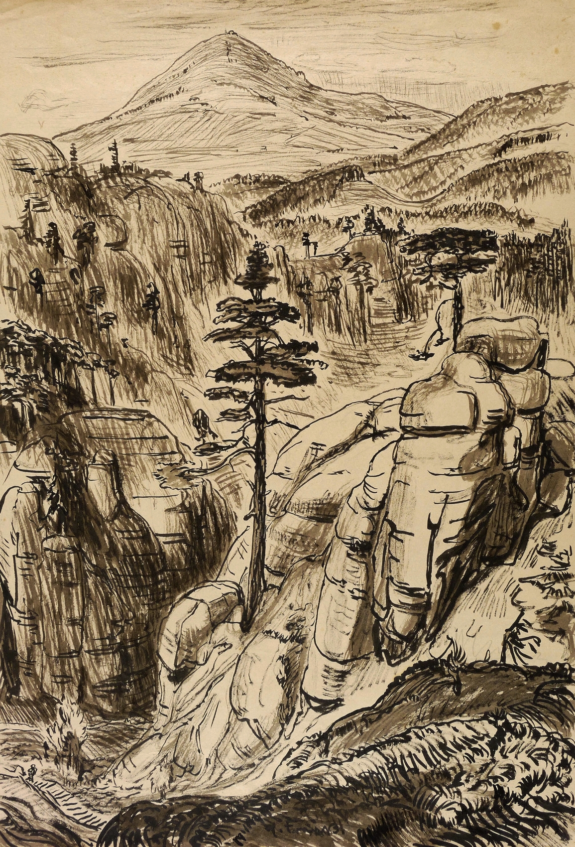 1938. Zeichnung / Rohrfeder, in schwarzer Tusche, auf rauem gelblichem Maschinenpapier. – Originale Künstlergrafik, von Erich Fraaß. – Unikat. – 55,8 x 38,2 cm (Darstellung / Blatt).