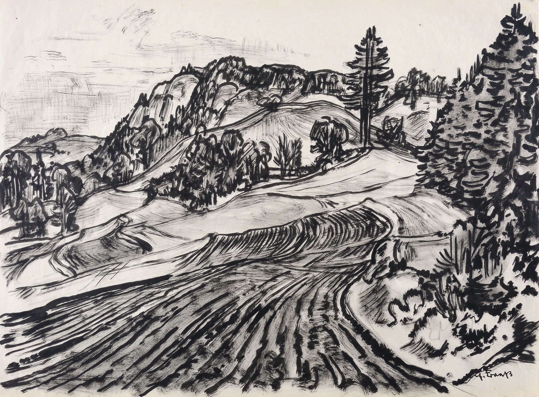 1954. Zeichnung / Pinselzeichnung, in schwarzer Tusche, auf leichtem hellgelbem Velin. – Originale Künstlergrafik, von Erich Fraaß. – Unikat. – 29,7 x 39,7 cm (Darstellung / Blatt).