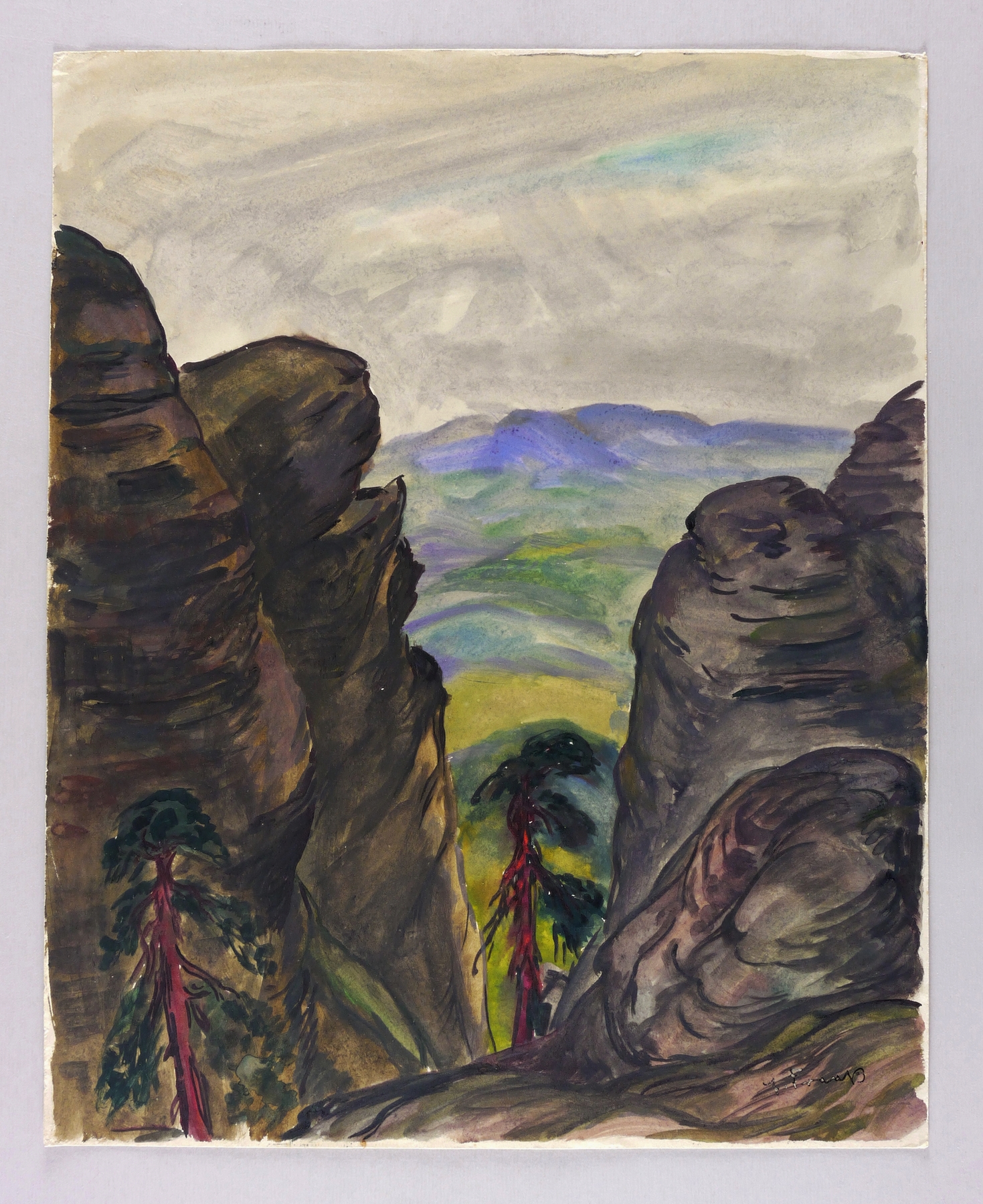 Links unten in schwarzer Feder signiert: ″E. Fraaß″. Verso in Bleistift bezeichnet: ″Sächs. Schweiz am Lilienstein, 1925″. – Sehr guter Zustand.