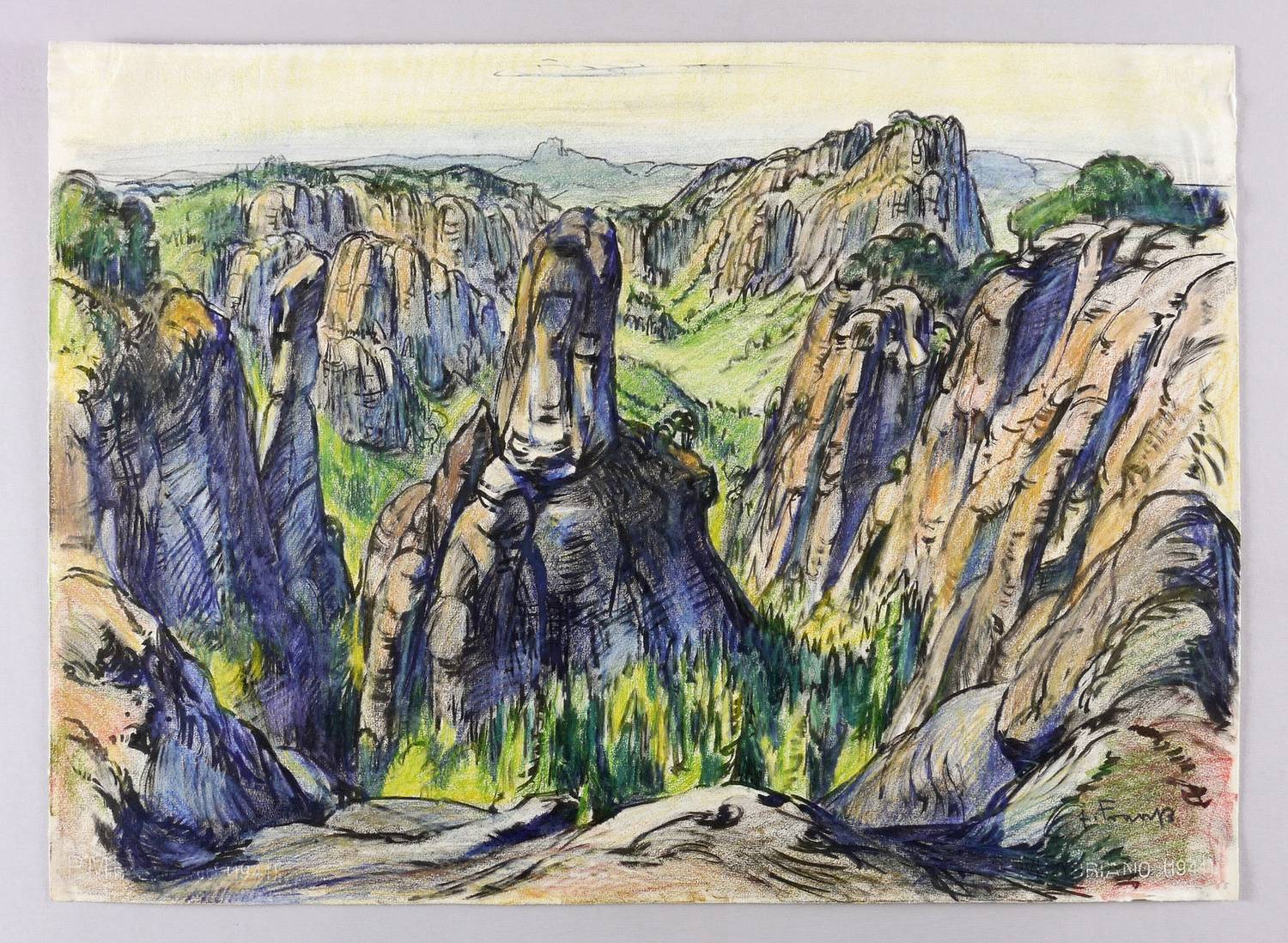Rechts unten in Farbkreide signiert: ″E. Fraaß″. Verso von fremder Hand in Bleistift bezeichnet: ″Schrammsteine Sächs. Schweiz / 1958 / Farbstift Tusche 66x48″″. Wasserzeichen von P.M. Fabriano 1941 – Blattkanten bisweilen leicht bestoßen. Insgesamt guter Zustand.