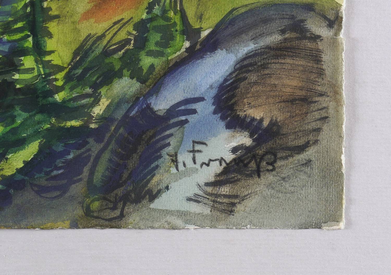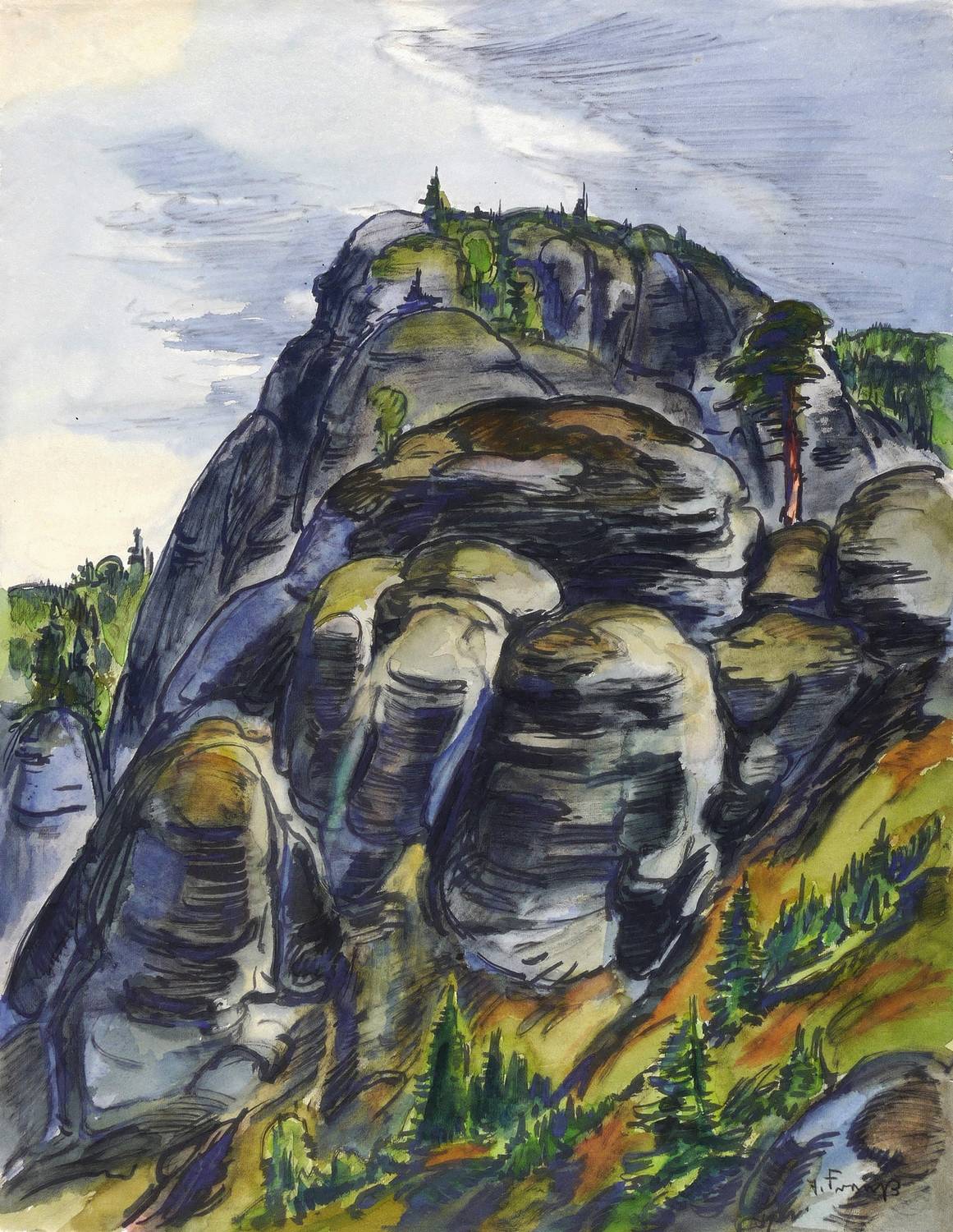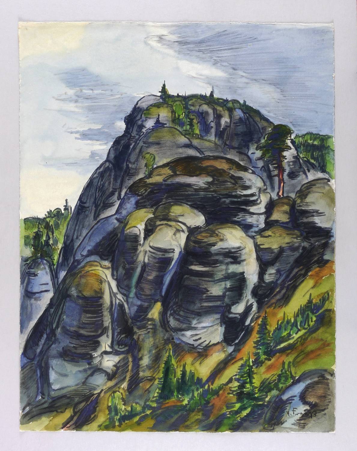 Rechts unten in Farbkreide signiert: ″E. Fraaß″. Verso in Bleistift bezeichnet: ″20. Felsen Sächs. Schweiz / 1952/52 / (48x62)″. Wasserzeichen Ingres. – Sehr guter Zustand.