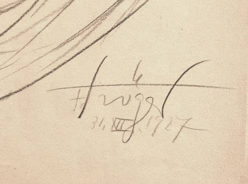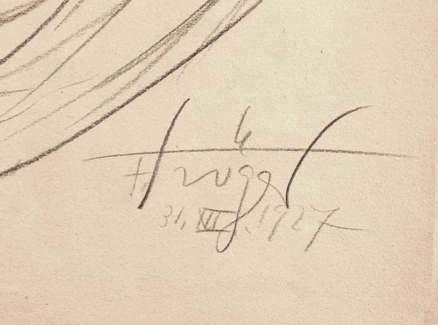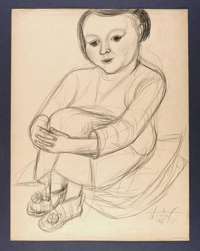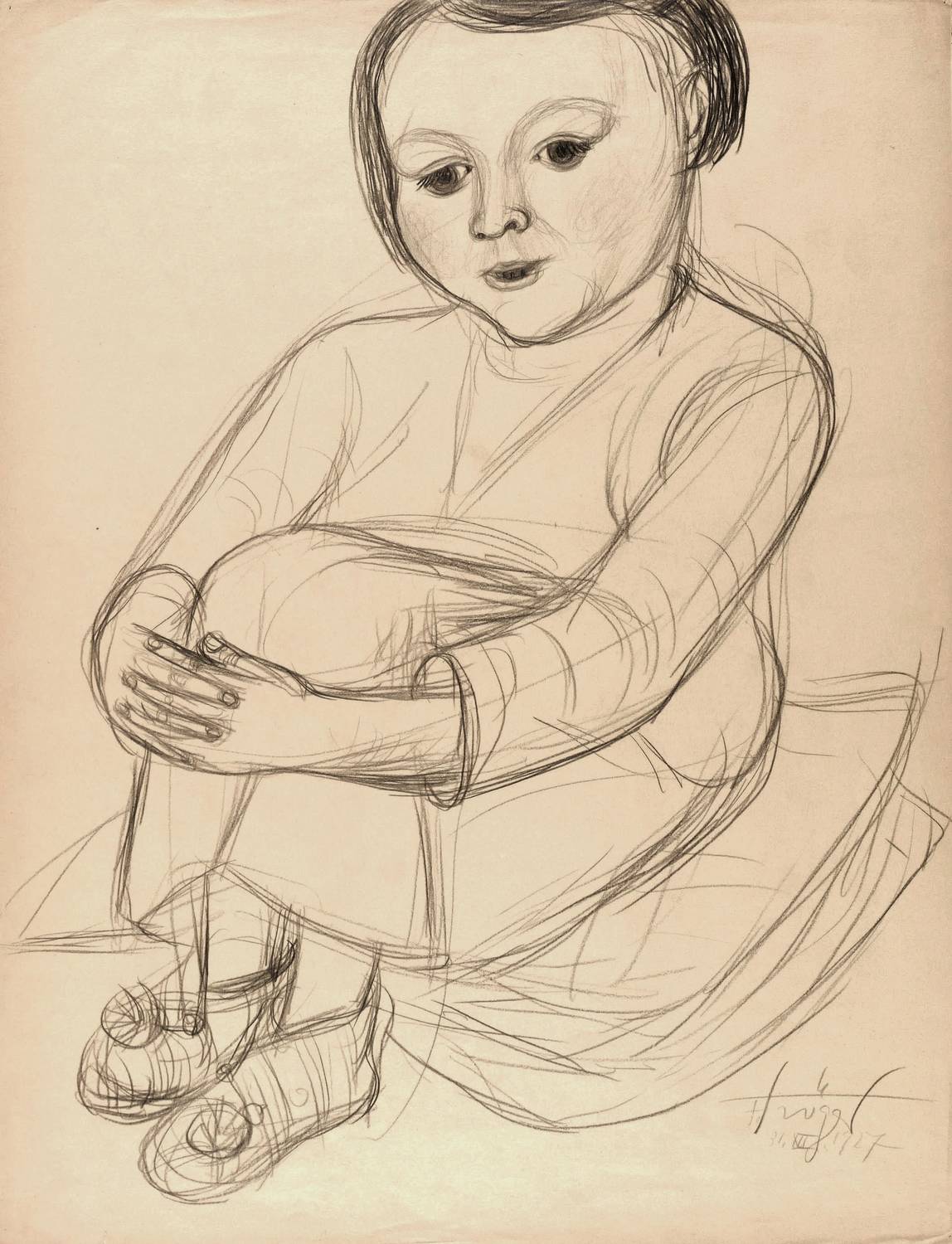 Rechts unten signiert und datiert: ″F. Tröger 31.XII.1927″. Verso in schwarzer Feder bezeichnet: ″Singendes Kind (Zeichnung)″. Dazu in Bleistift Qualitätssigel: ″XXXO″. – Auf einem Kissen hockendes Kind mit angezogenen Knieen und Pantoffeln. – In den Ecken originale Reißzwecklöchlein. Im unteren Rand kleines hinterlegtes Risschen. Wenige Knickspuren. Insgesamt guter Zustand.