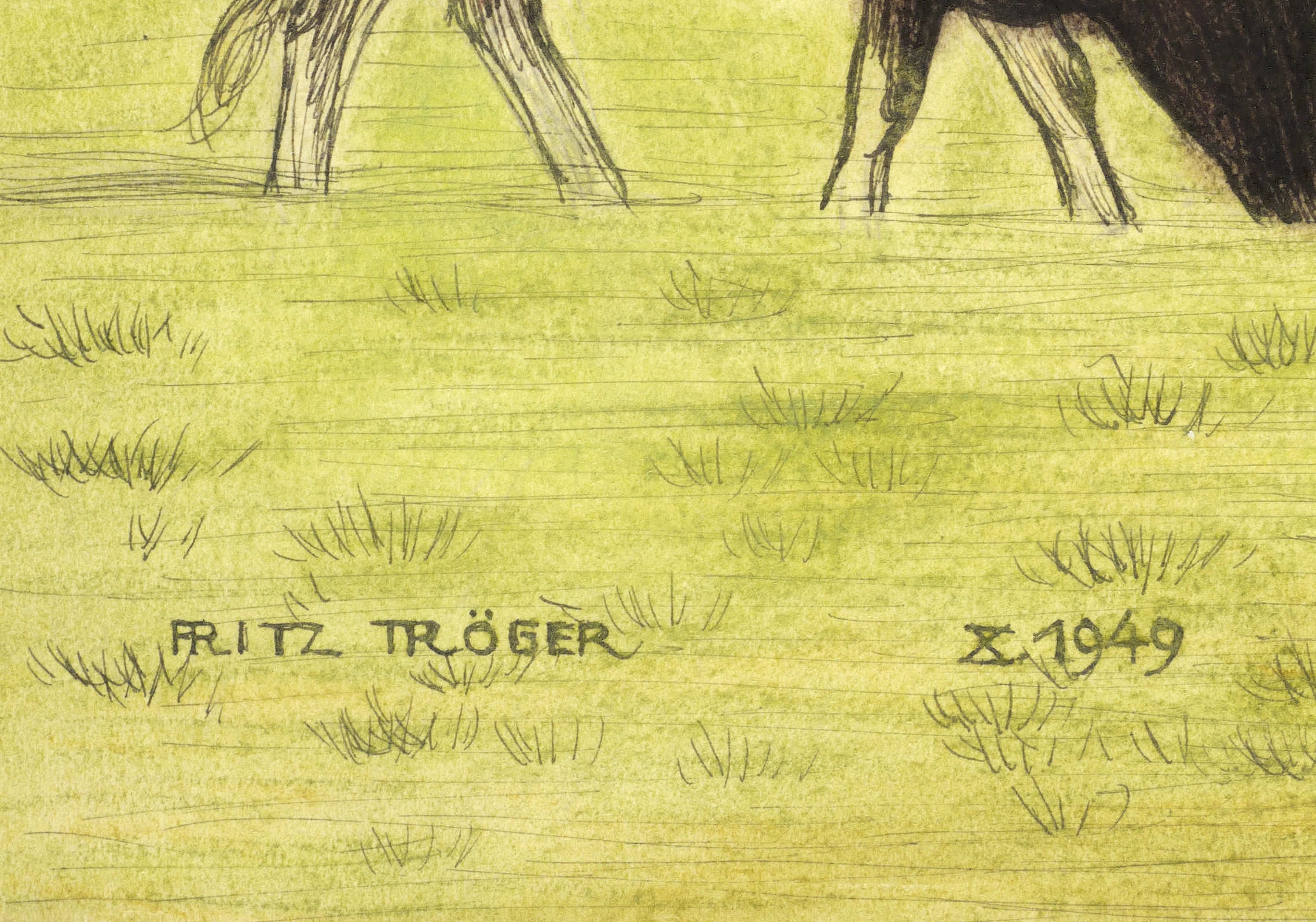 Links unten in schwarzer Feder signiert und datiert: ″FRITZ TRÖGER X.1949″. Verso in Kopierstift ausführlich bezeichnet. In Bleistift Qualitätssigel: ″XX″. – Tadellos. Sehr guter Zustand.