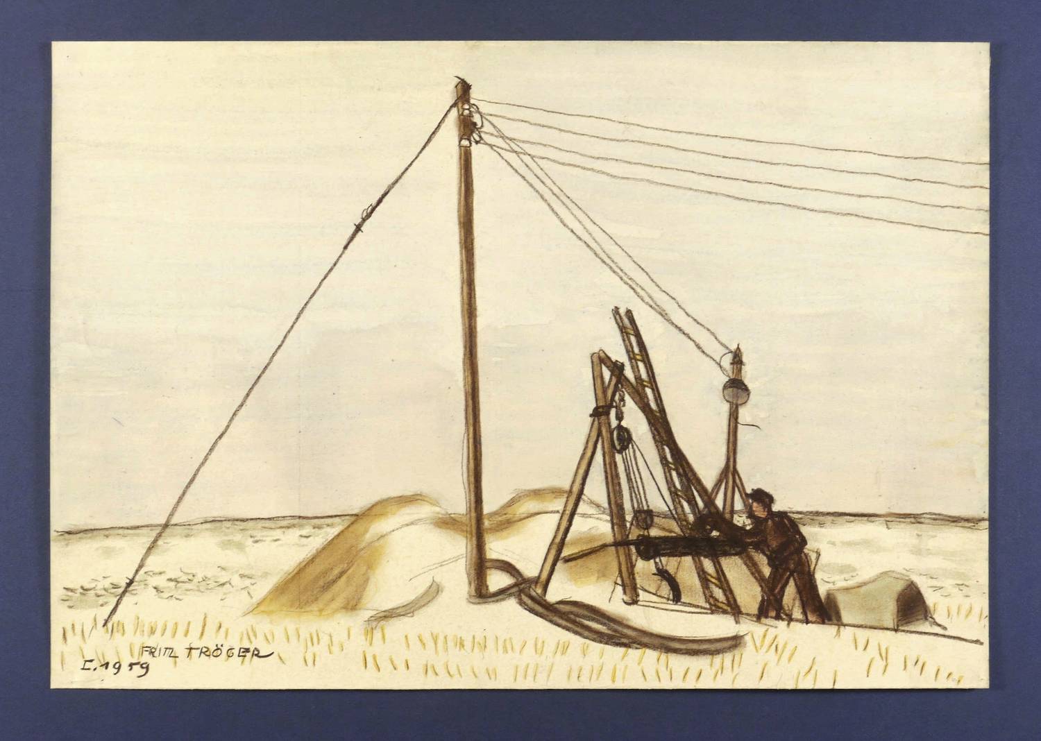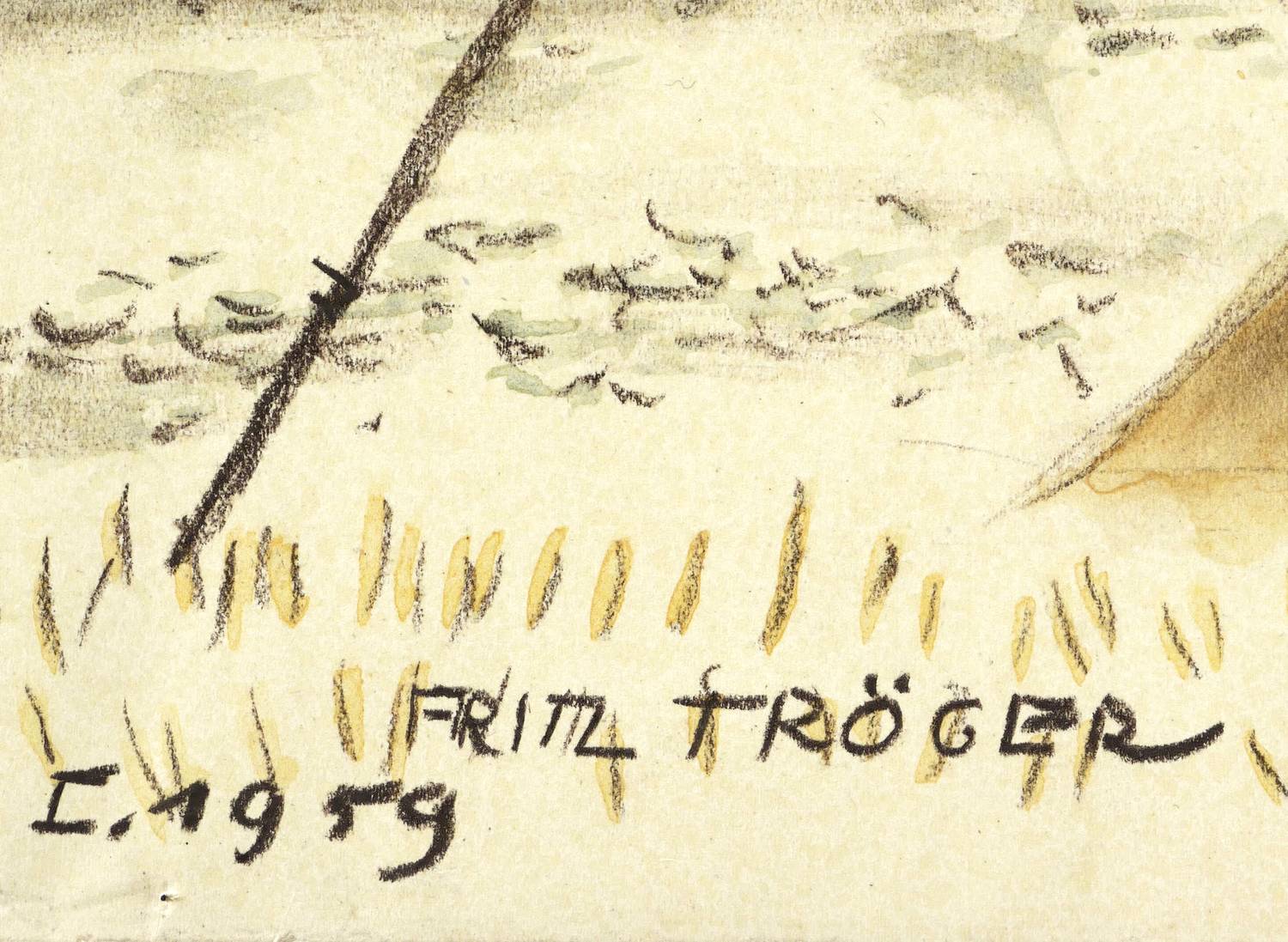 1959. Mischtechnik / Pastellkreide & Aquarell, auf glattem hellgelbem Karton. – Originale Künstlergrafik, von Fritz Tröger. – Unikat. – 40,0 x 57,8 cm (Darstellung / Blatt).