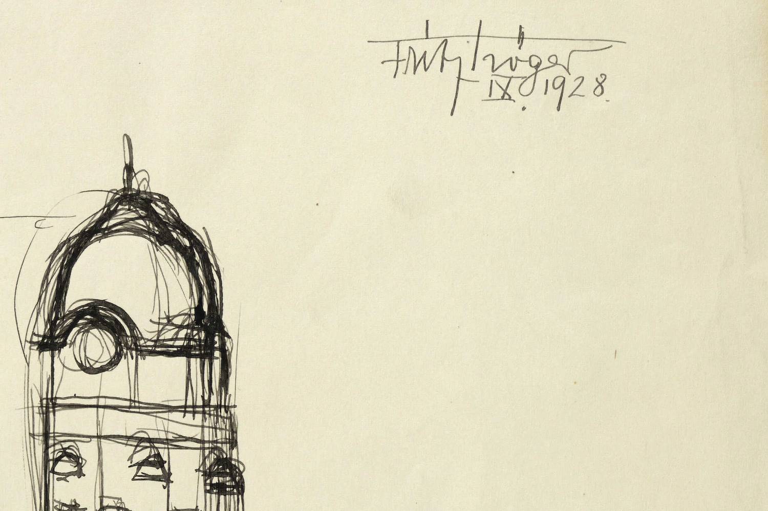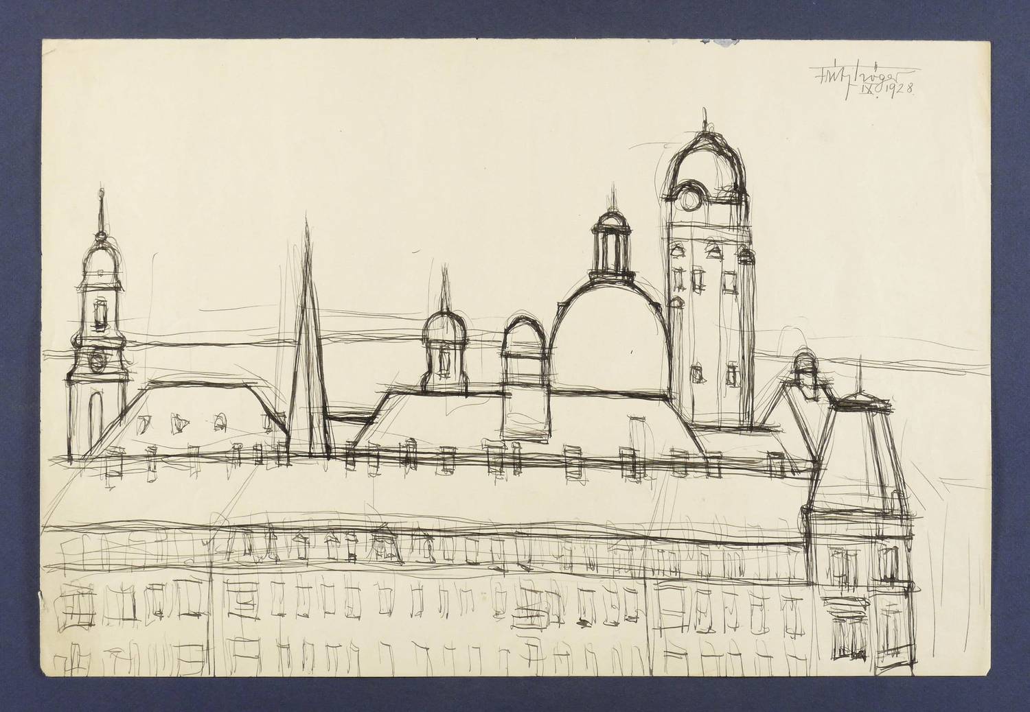 1928. Zeichnung / Federzeichnung, in schwarzer Tusche, auf hellgelbem Papier. – Originale Künstlergrafik, von Fritz Tröger. – Unikat. – 31,9 x 47,5 cm (Darstellung / Blatt).