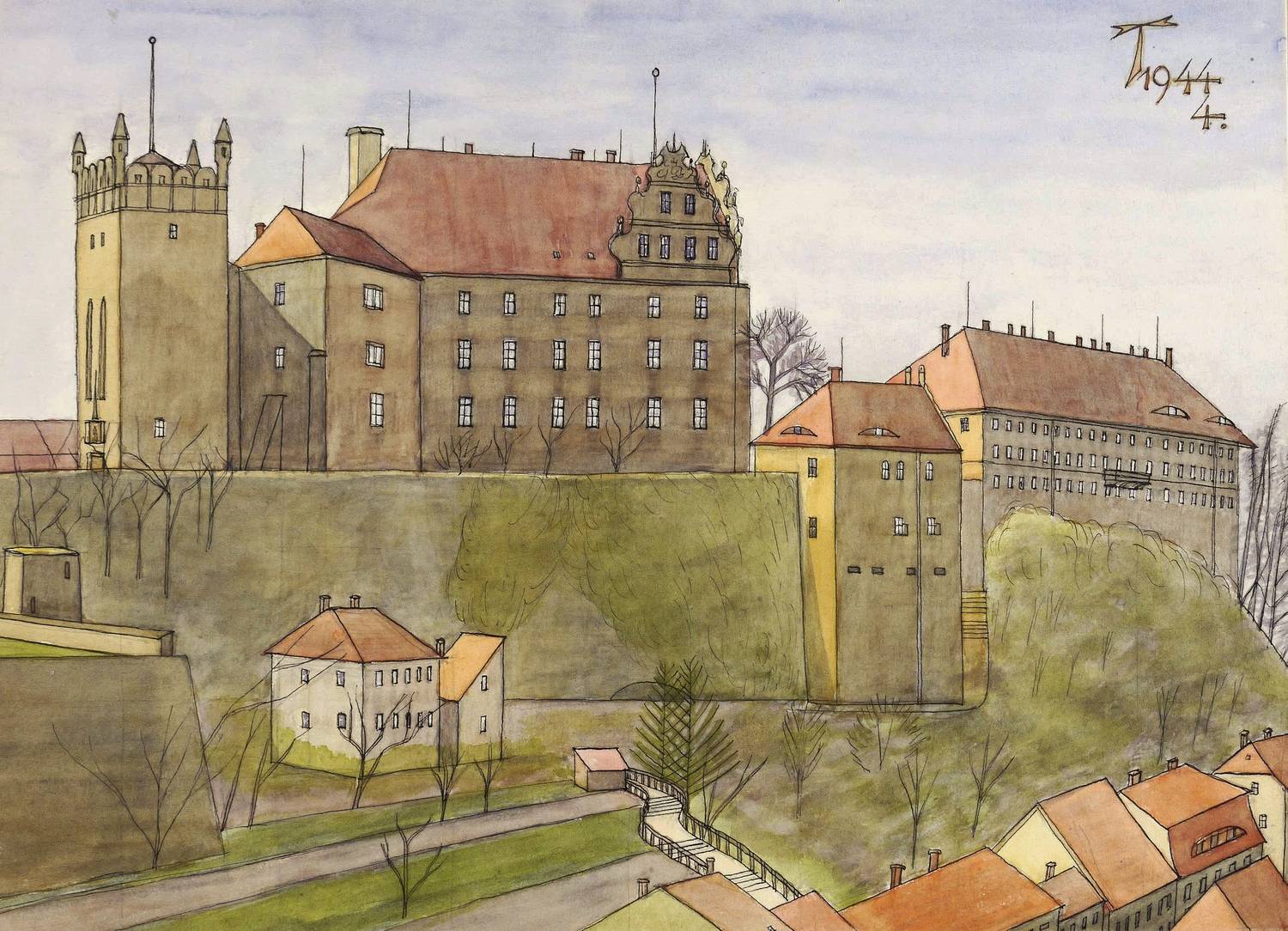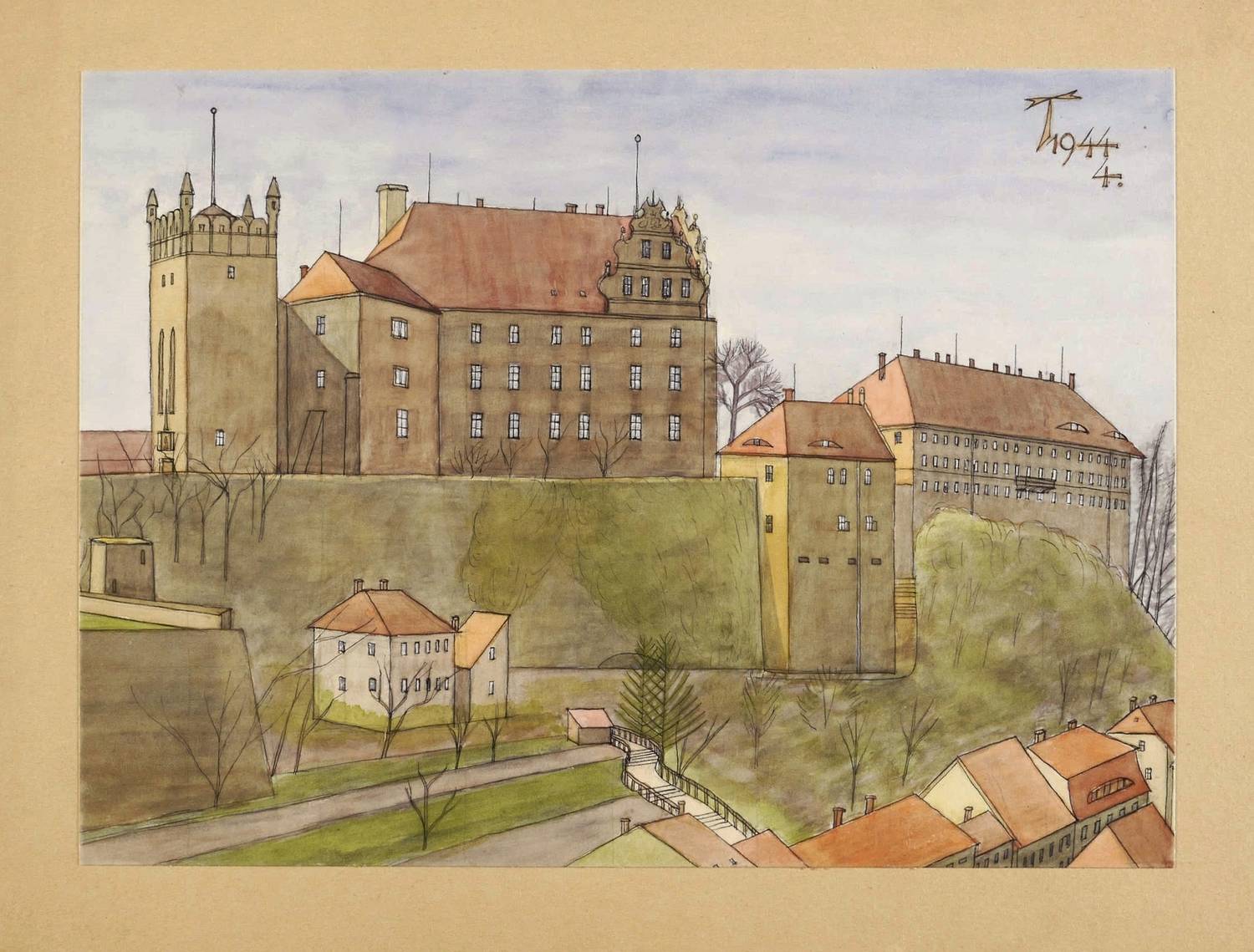 1944. Mischtechnik / Aquarell & Feder, auf kräftigem Papier. – Originale Künstlergrafik, von Fritz Tröger. – Unikat. – 24,0 x 32,9 cm (Darstellung / Blatt), 33 x 41,5 cm (Trägerkarton).