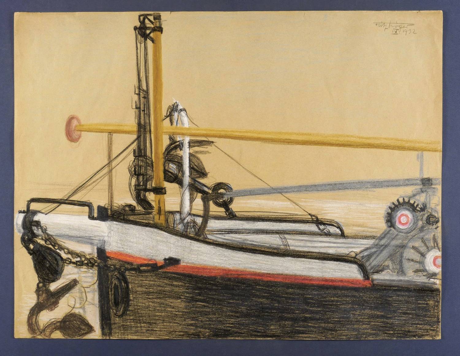 Rechts oben in schwarzer Kreide signiert und datiert: ″Fritz Tröger / IX.1932″. Verso in schwarzer Feder ausführlich bezeichnet: ″Bug eines Frachtdampfers (farbige Ölkreide)″. In Bleistift Qualitätssigel: ″XXX″. – Geringfügige Randmängel. Leichte Montagespuren. Insgesamt guter Zustand.