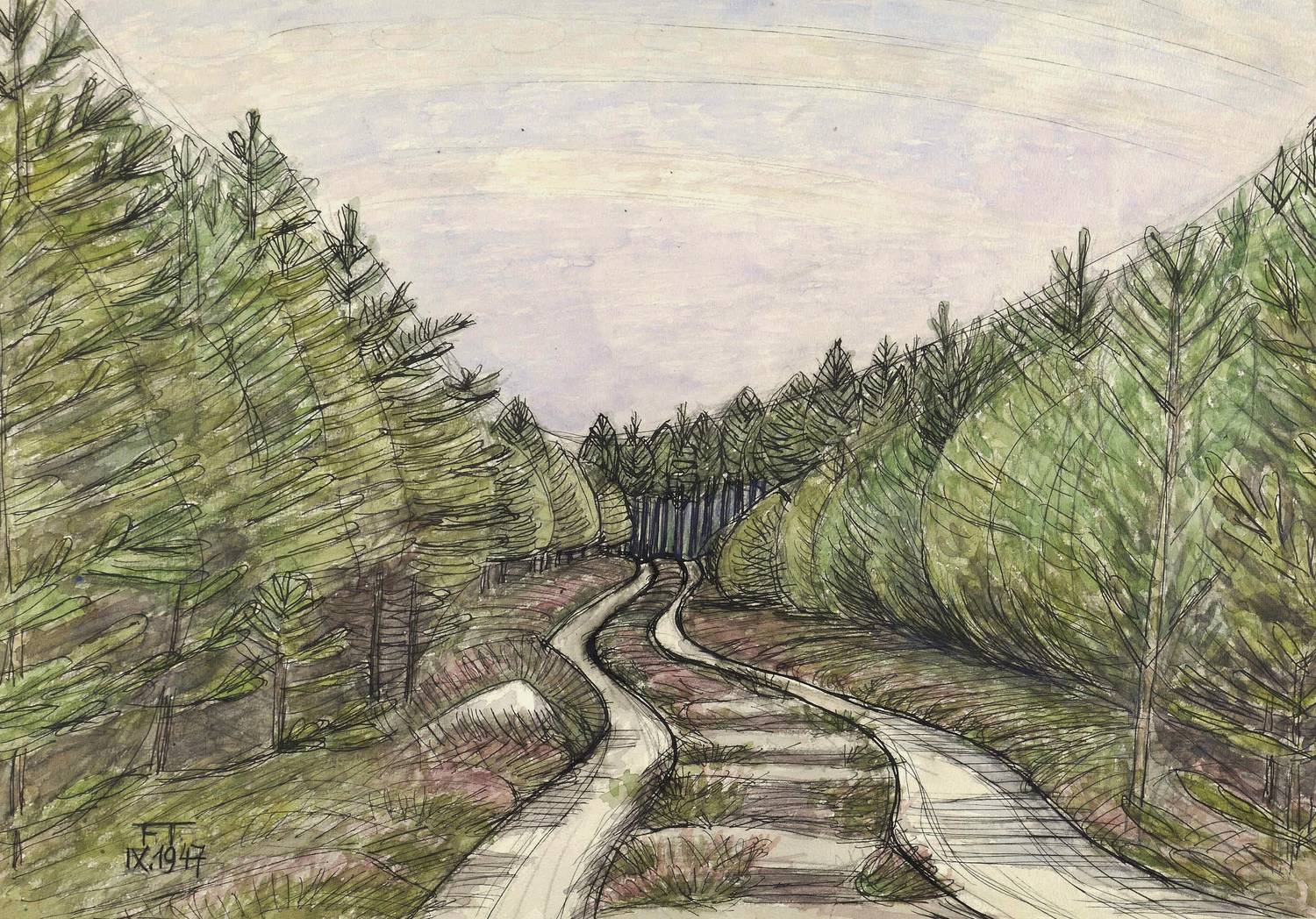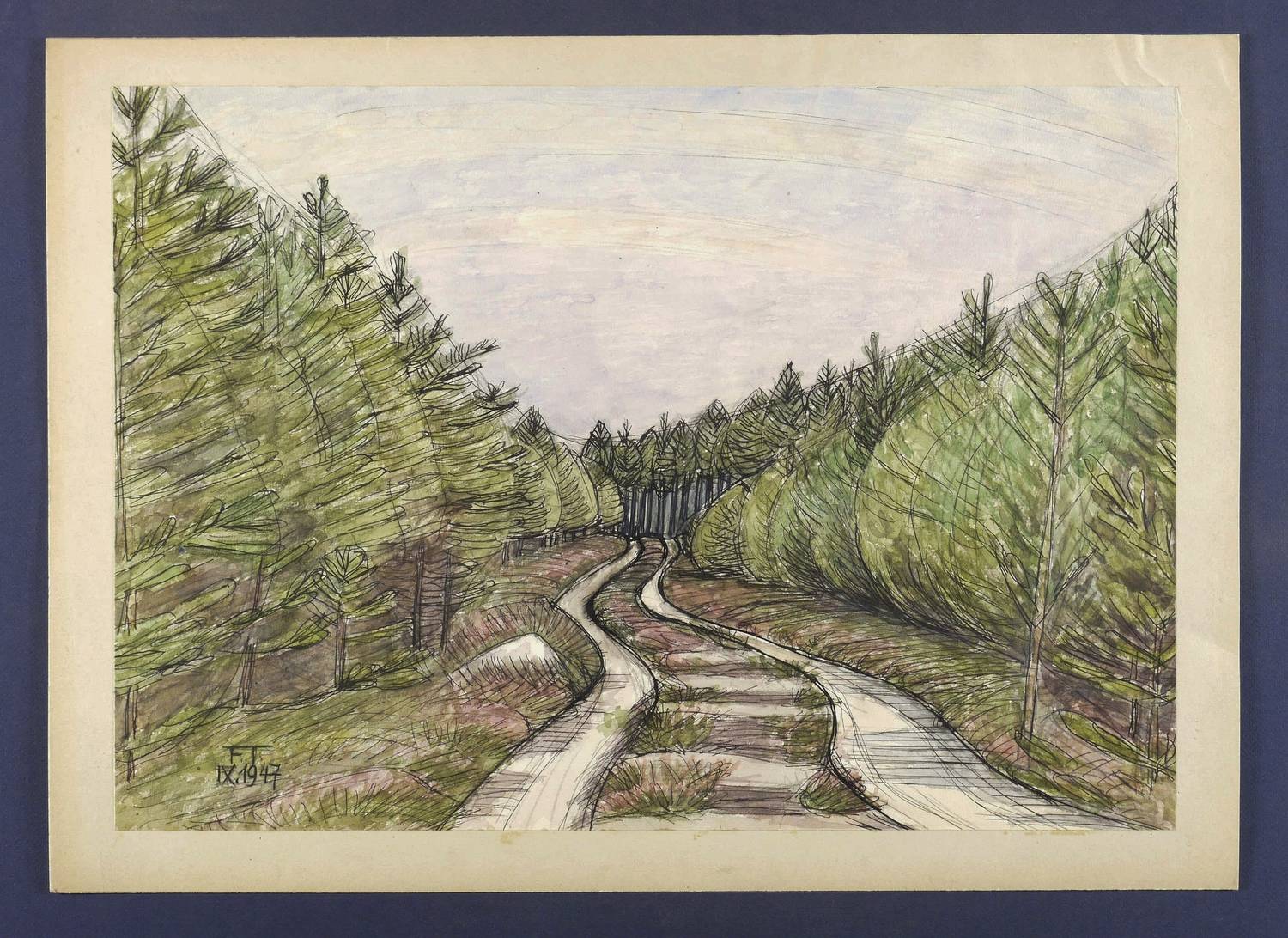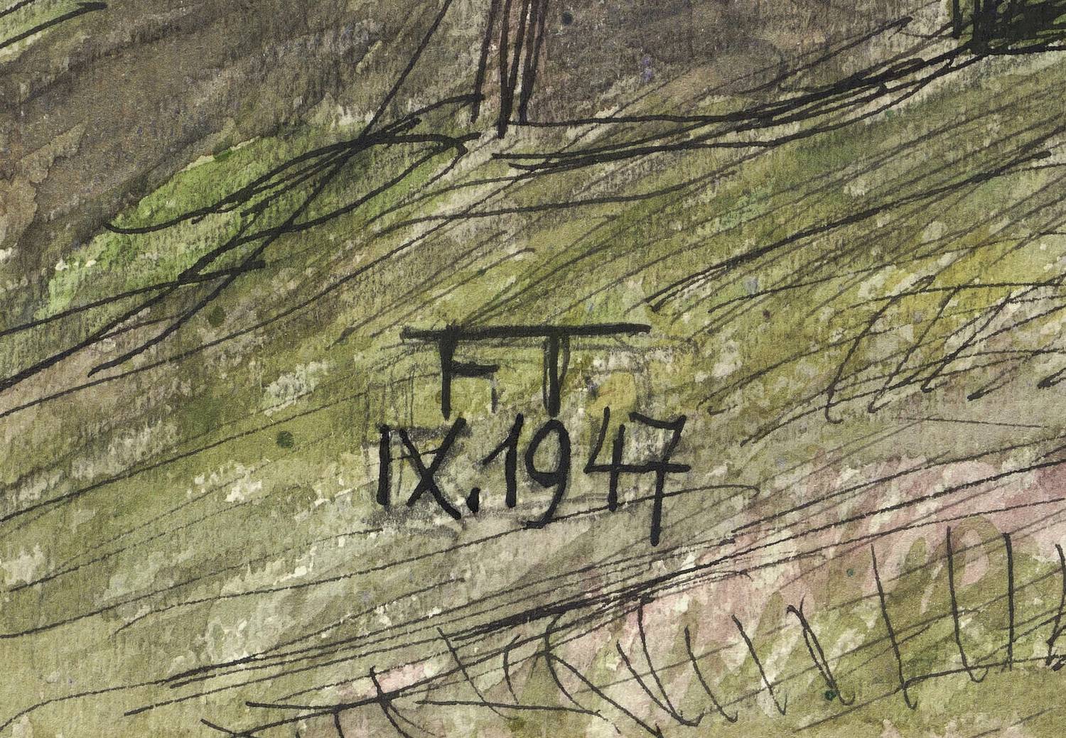 1947. Mischtechnik / Aquarell & Feder, auf kräftigem Aquarellkarton. – Originale Künstlergrafik, von Fritz Tröger. – Unikat. – 37,1 x 52,9 cm (Darstellung / Blatt), 42,5 x 59,5 cm (Trägerkarton).