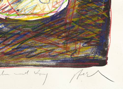 2009. Lithografie / Kreidelithografie, mit Farbstiften überarbeitet, auf hellchamois Büttenpapier. – Originale Künstlergrafik, von Silvio Zesch. – Unikat. – 27,0 x 31,5 cm (Darstellung), 30,5 x 37,0 cm (Stein), 35,5 x 39,5 cm (Blatt).