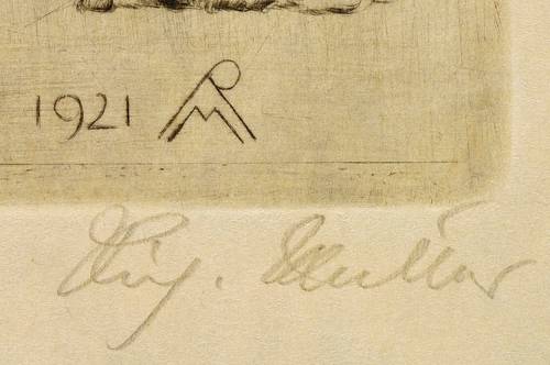 Richard Müller (1874 Tschirnitz / Eger - 1954 Dresden). Bekannter Maler und Grafiker in Dresden. Lernte an der Zeichenschule der Porzellanmanufaktur Meißen, ging 1890 an die Akademie in Dresden, wo er bei Leon Pohle, Ernst Moritz Geyger und Leonhard Gey studierte. Wurde von Max Klinger für die Radierkunst begeistert. War 1900 von bis 1935 Professor für Zeichnung an der Dresdner Akademie, ab 1933 Rektor ebenda. Zu seinen Schülern zählten George Grosz, Richard Scheibe und Max Ackermann.