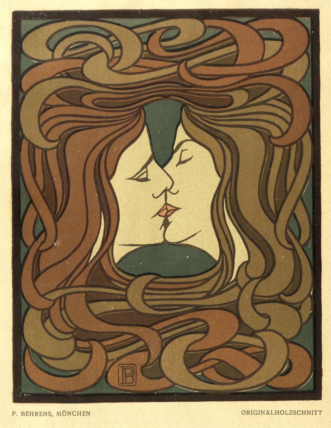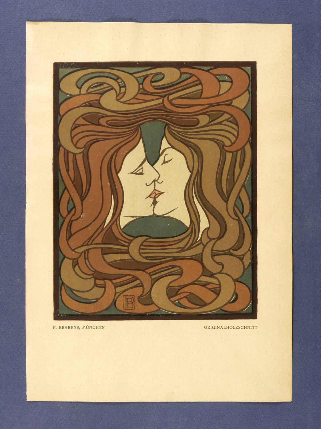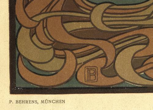 Aus: Die Kunst. Monatshefte für freie und angewandte Kunst (München: Magazinpresse-Verlag 1900), Bd. 2. – Nicht handsigniert. Unterhalb typografisch bezeichnet: ″P. BEHRENS, MÜNCHEN / ORIGINALHOLZSCHNITT″. Im Druckstock unten Monogramm PB. – Kleinere der zwei bekannten Versionen dieses Farbholzschnitts, 1900 als originalgrafische Beilage in dem Münchner Magazin ″Die Kunst″ erschienen. Die Größere kam 1898 im ″Pan″ heraus. - Druckgrafisches Hauptwerk des Künstlers und zugleich eine Inkunabel des Jugendstil in Deutschland. – Papier altersbedingt geringfügig gegilbt. In den äußeren Blattkanten oben und unten partiell unmerklich fleckig. Schöner Gesamteindruck. Insgesamt guter Erhaltungszustand.