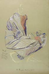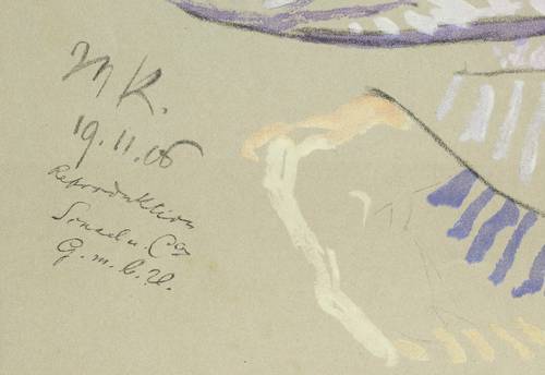 Aus: Max Klinger, Zwanzig Studien zu Bildern, Plastiken und Stichen (Leipzig: Selbstverlag 1914). – Links am Rand Monogramm und Datum. In der Darstellung links unten bezeichnet: ″M. Klingers Studien No. 5″. – Blatt Nr. 5 der aufwändig hergestellten Studien-Mappe mit 20 Farblichtdrucken nach Zeichnungen zu diversen Plastiken und Wandgemälden. Sie wurde von der Graphischen Kunstanstalt Sinsel & Co in Leipzig in einer hochwertigen Auflage von 250 Stück gedruckt und von der Galerie Ernst Arnold in Dresden vertrieben. 2013 widmete das Max-Klinger-Haus Naumburg ihr eine Ausstellung. - Eines von 250 Exemplaren. – Farbfrisch. Links oben im Rand unshceinbare Knickspur. Insgesamt guter bis sehr guter Zustand.