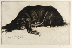 Günther 67. – Rechts unten in Bleistift signiert: ″Rich. Müller″. Zusätzlich in der Platte links unten betitelt, datiert und signiert: ″(Mein Quiuck.) / October 1912 - Rich. Müller.″ – Die Vorlage für dieses Blatt stammt aus dem Jahr 1902. 1946 entstand ein kleinformatiges Gemälde. - Richard Müller hat diesen King- Charles-Spaniel immer wieder gezeichnet. Königin Carola von Sachsen verlangte, nachdem sie eine Zeichnung des Hündchens auf einer Ausstellung gesehen hatte, das Tier zu sehen. Daraufhin durfte Quick mit einer Hündin der Königin für Nachwuchs sorgen. – Originalrandiges Exemplar. Tadellose Erhaltung. Sehr guter Zustand.