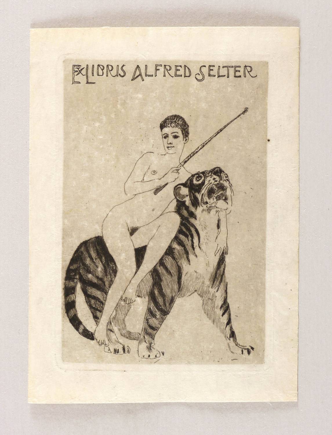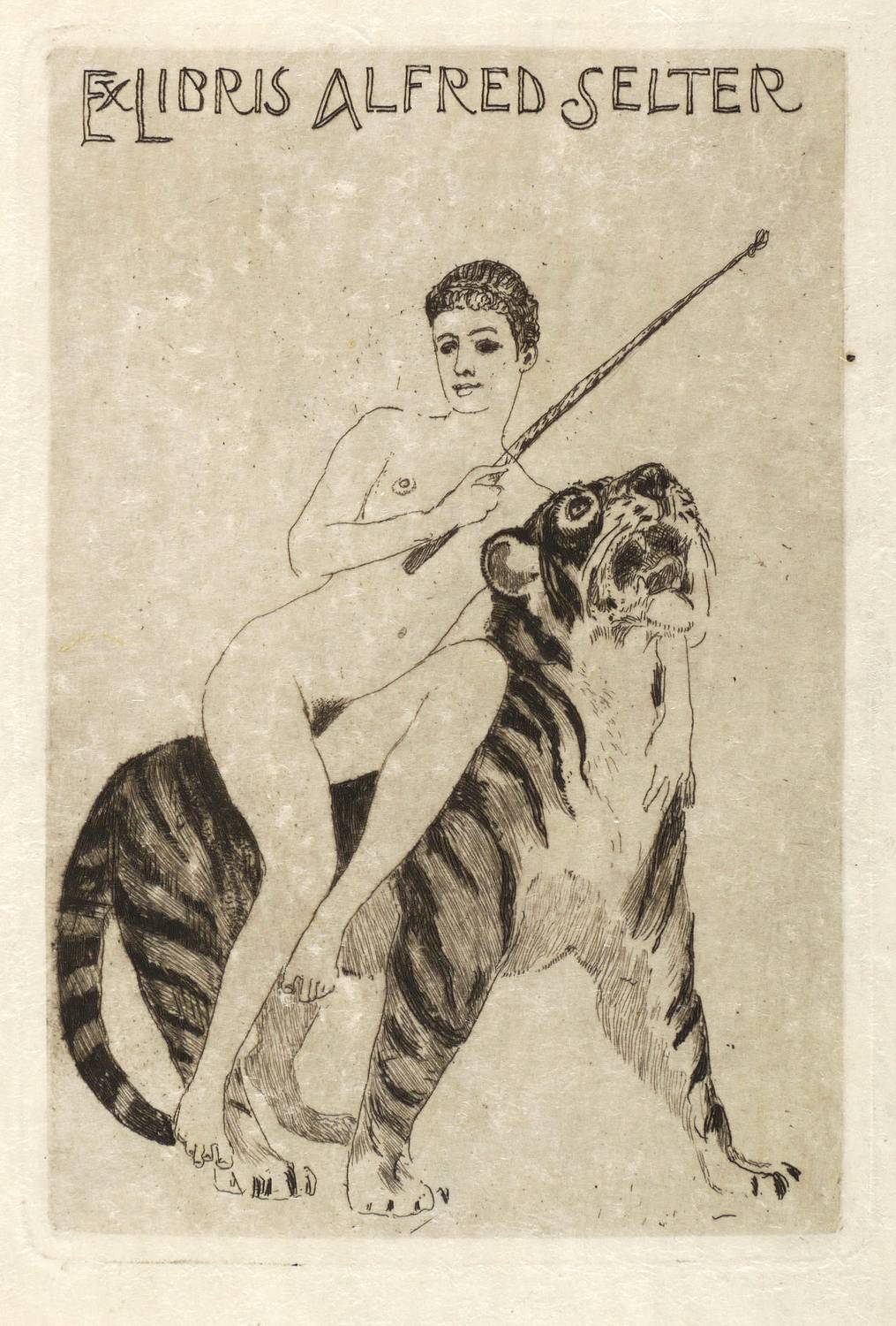 1919. Radierung / Strichätzung, mit Plattenton, in Schwarz, auf hellgelbem Japan. – Exlibris, von Max Klinger. – 12,4 x 8,3 cm (Darstellung / Druckbild), 13,0 x 8,9 cm (Platte), 16 x 11 cm (Blatt).