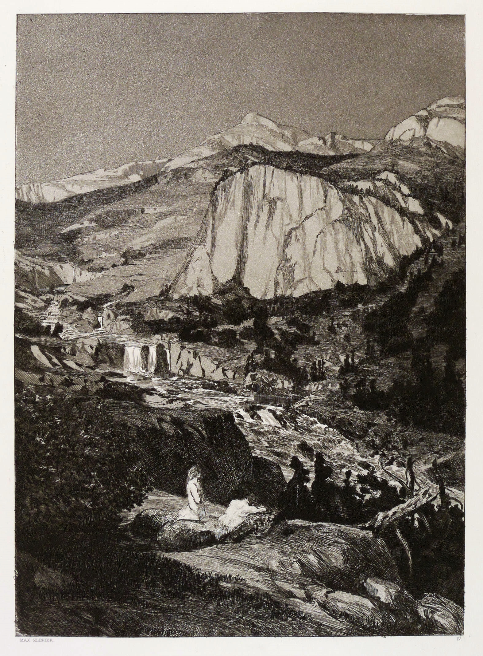 Singer 56 III (von III). – Aus: Max Klinger, Intermezzi. Componirt, radirt und Herrn Kupferstecher und Kunsthändler Sagert dankbarst zugeeignet (München: Ströfer's Kunstverlag 1881). – In der Platte links unten gestochene Signatur: ″MAX KLINGER″. Rechts nummeriert: ″IV″. – Unbeschnittenes Exemplar. Leichte Randmängel, rechts Quetschfalte, oben kleiner Einriss fachgerecht geschlossen. Mäßig guter bis guter Zustand.