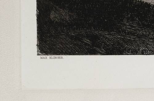 1881. Radierung / Strichätzung & Aquatinta, in Schwarz, auf aufgewalztem gelbem China, auf Kupferdruckkarton. – Originale Künstlergrafik, von Max Klinger. – 36,4 x 26,5 cm (Darstellung), 42,0 x 29,9 cm (Platte), 63 x 45 cm (Blatt).