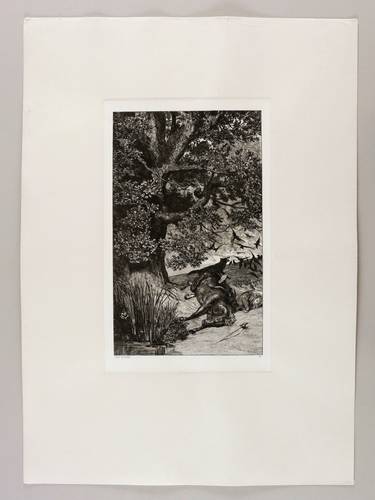 1881. Radierung / Strichätzung & Kaltnadel, in Schwarz, auf gewalztem China, auf Kupferdruckkarton. – Originale Künstlergrafik, von Max Klinger. – 32,6 x 19,9 cm (Darstellung / Einfassungslinie), 37,1 x 23,1 cm (Platte), 63 x 45 cm (Blatt).